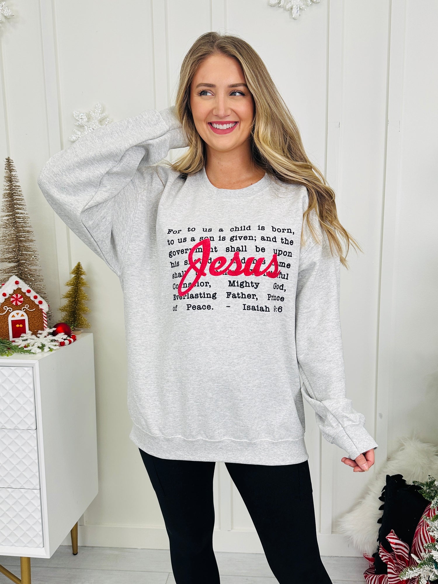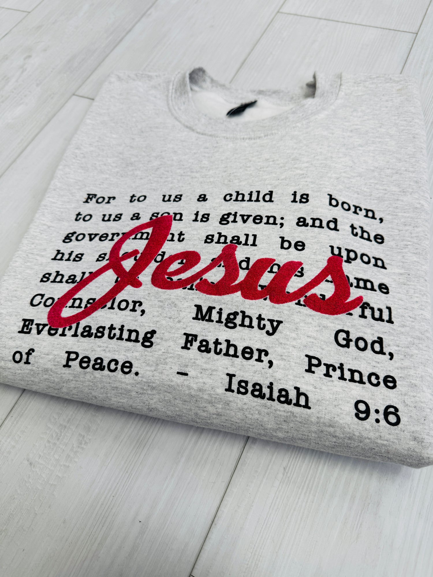 Spread the true meaning of Christmas with this new A Child Is Born Crewneck. This piece beautifully features the powerful words of Isaiah 9:6, highlighting the birth of Jesus, with His name emphasized in glitter red ink. It’s a heartwarming and meaningful way to celebrate the season.
