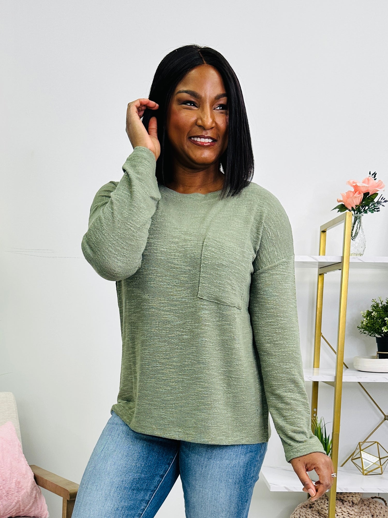This easygoing top features a softly textured knit with a clean round neckline and a relaxed silhouette that makes it perfect for everyday wear. The chest pocket adds a simple, functional touch while keeping the look polished and laid-back. Finished with long sleeves and a comfortable length, it’s an effortless piece you’ll reach for again and again.