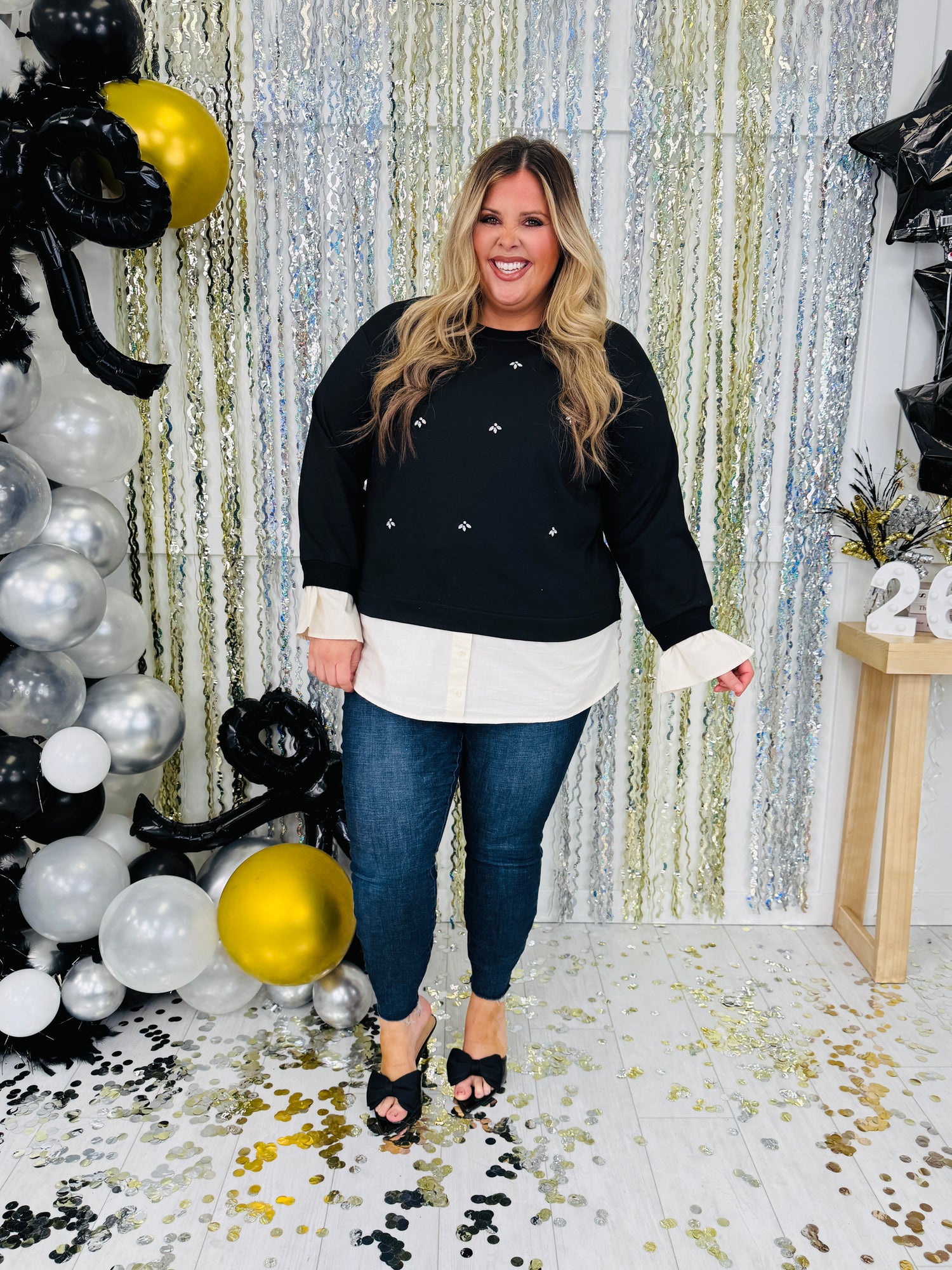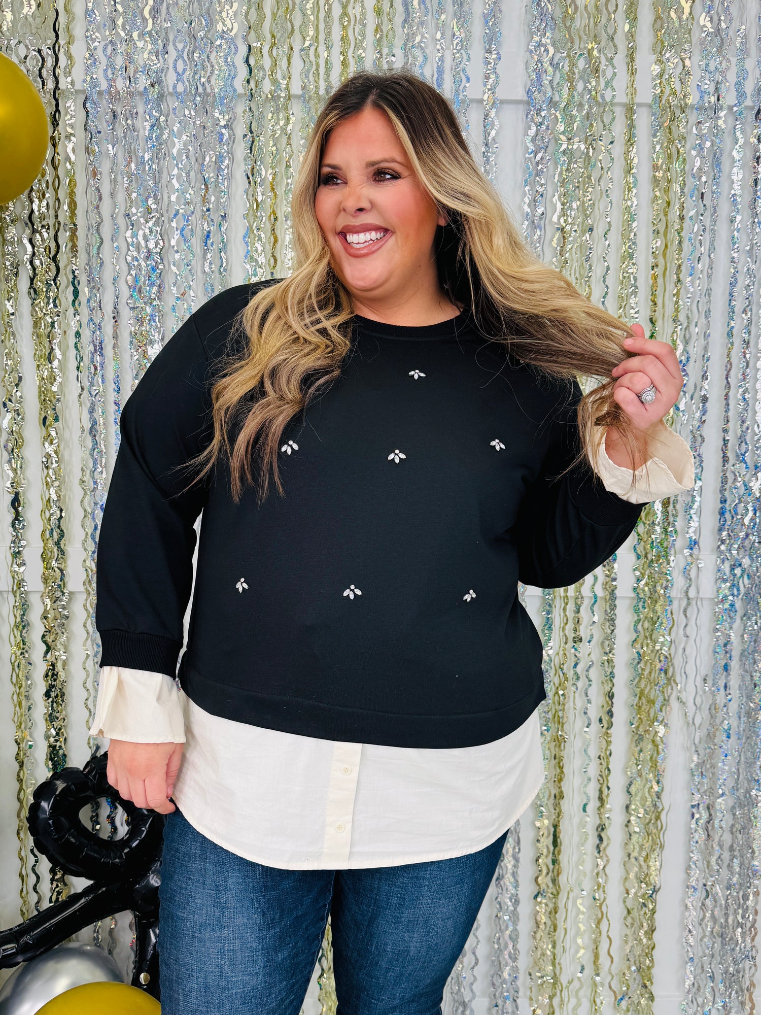 This darling top gives you that chic, layered-blouse moment without any of the bulk thanks to its clever panel design that peeks out at the hem and cuffs. The front is sprinkled with tiny sparkly accents that add just the right touch of shine, keeping things fun while still totally wearable. Finished with soft, mixed textures that make it feel both elevated and effortless, this is the piece you’ll reach for when you want cute-and-comfy all in one.