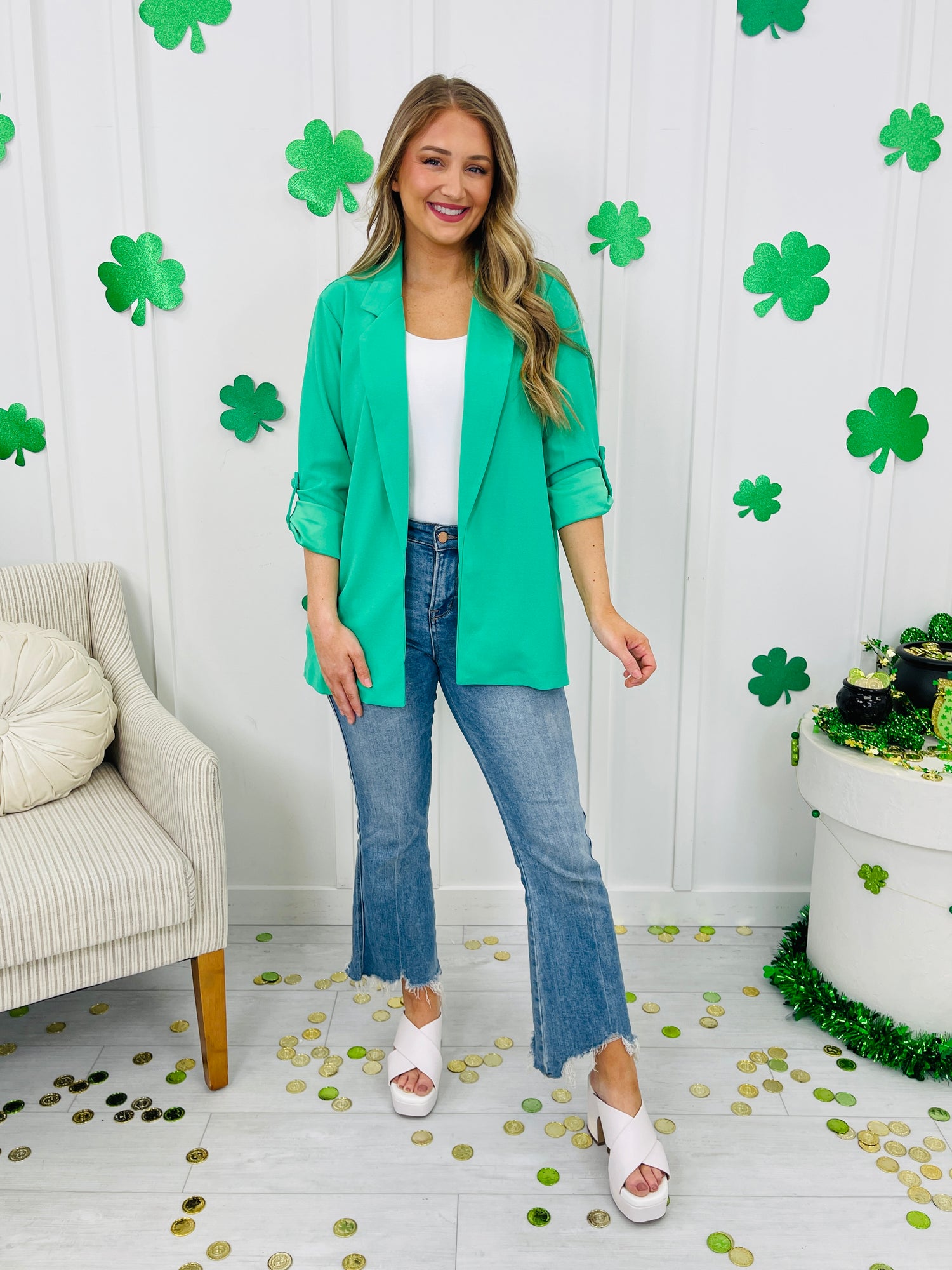 This piece is the definition of effortless polish, with an open-front blazer silhouette and clean lapel detail that instantly elevates any outfit. The cuffed sleeves keep it feeling relaxed and wearable, while the smooth, draped shape makes it an easy layer you’ll reach for on repeat—perfect for dressing up basics in seconds.