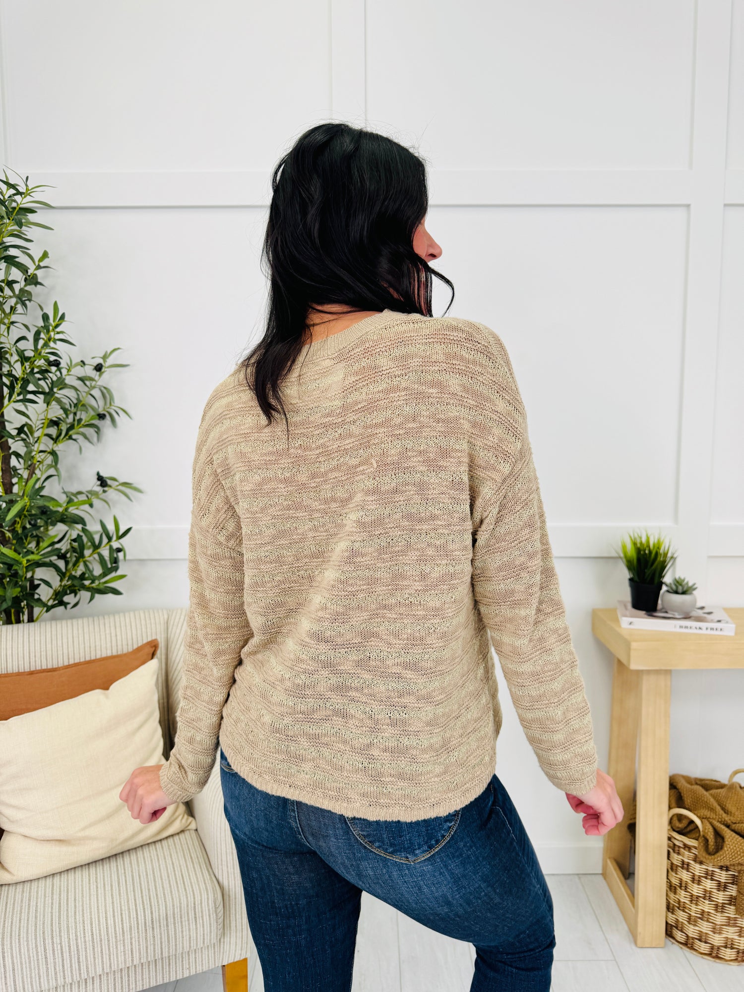 This cozy sweater is the perfect blend of casual comfort and effortless style. The striped, textured knit adds subtle detail while keeping the look versatile and timeless. With its relaxed, easy fit and classic crew neckline, it’s a staple you’ll love pairing with denim for an everyday polished feel.