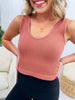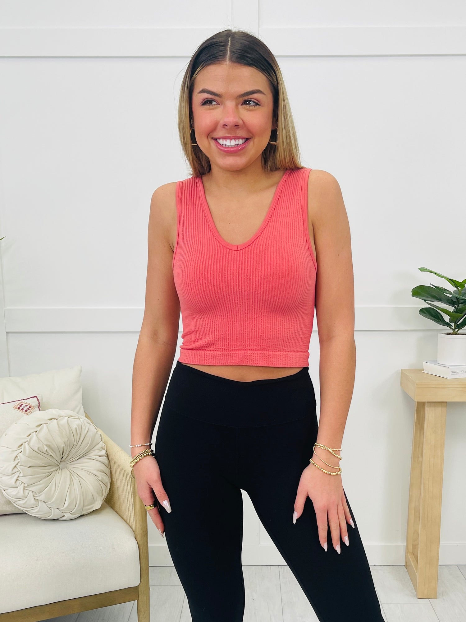 This super soft and stretchy cropped tank top comes in several colors, with a textured fabric and a flattering v-neck. It's the perfect top for a comfortable and stylish look!