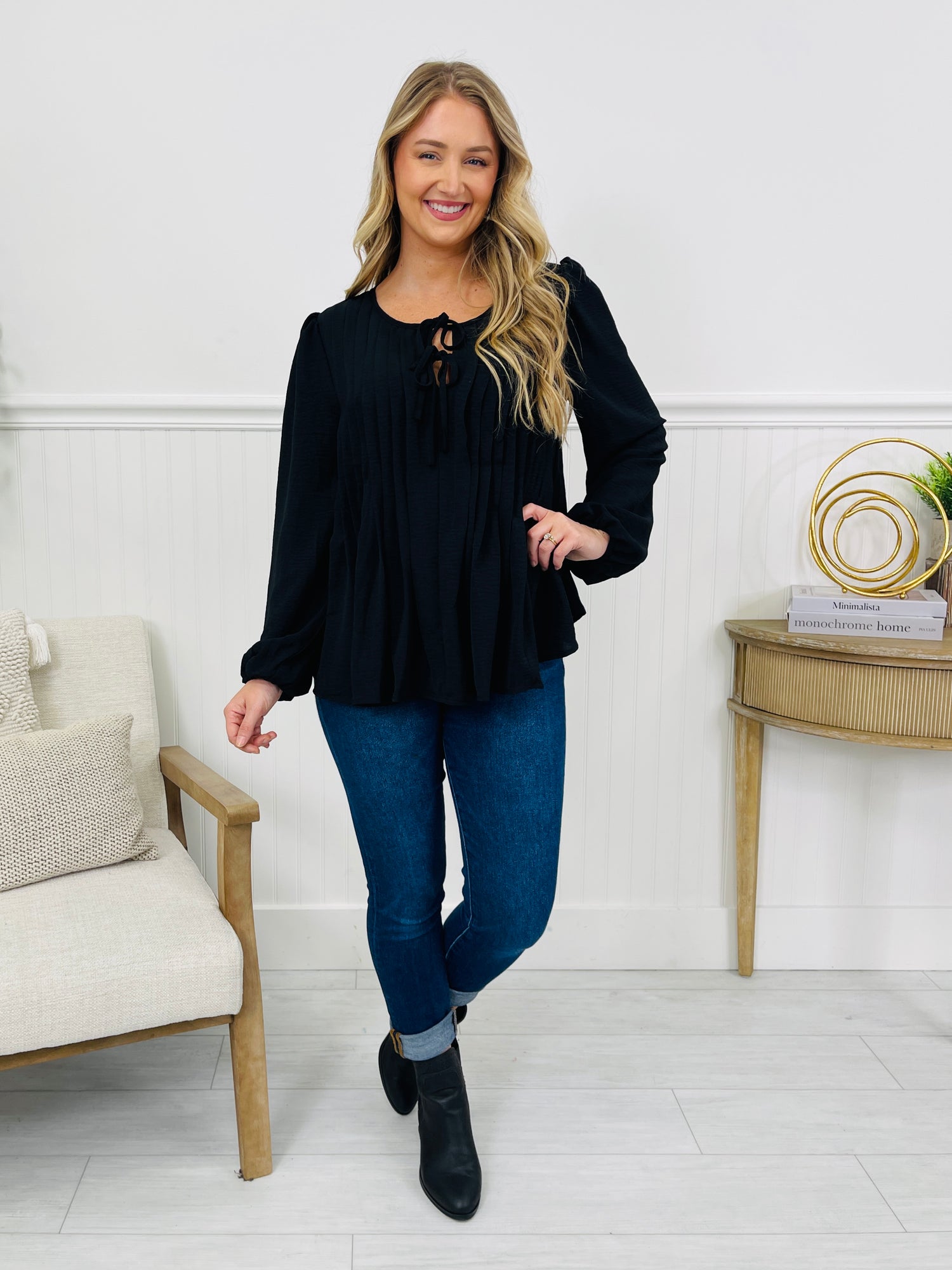This beautiful top features a feminine tie-front neckline paired with soft pleated detailing that runs down the front for an elevated, elegant look. The flowy silhouette drapes effortlessly, giving it a relaxed shape that moves with you while still feeling polished. Finished with long sleeves and gentle gathers at the shoulders, it’s a charming piece that works for both dressed-up and everyday wear.