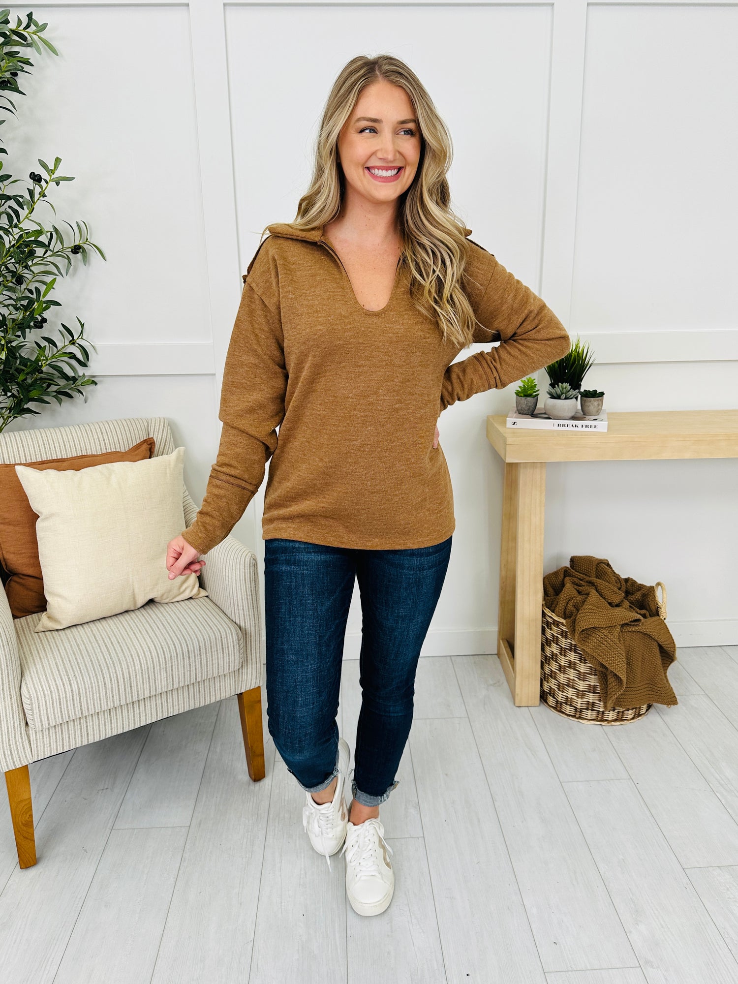 Laid-back and polished, this pullover features a notched collar neckline that creates a soft V and frames the neckline. The heathered knit adds subtle dimension, while drop shoulder and reverse stitched long sleeves finish it with easy, casual detail. A straight hem keeps the silhouette clean and effortless with denim.