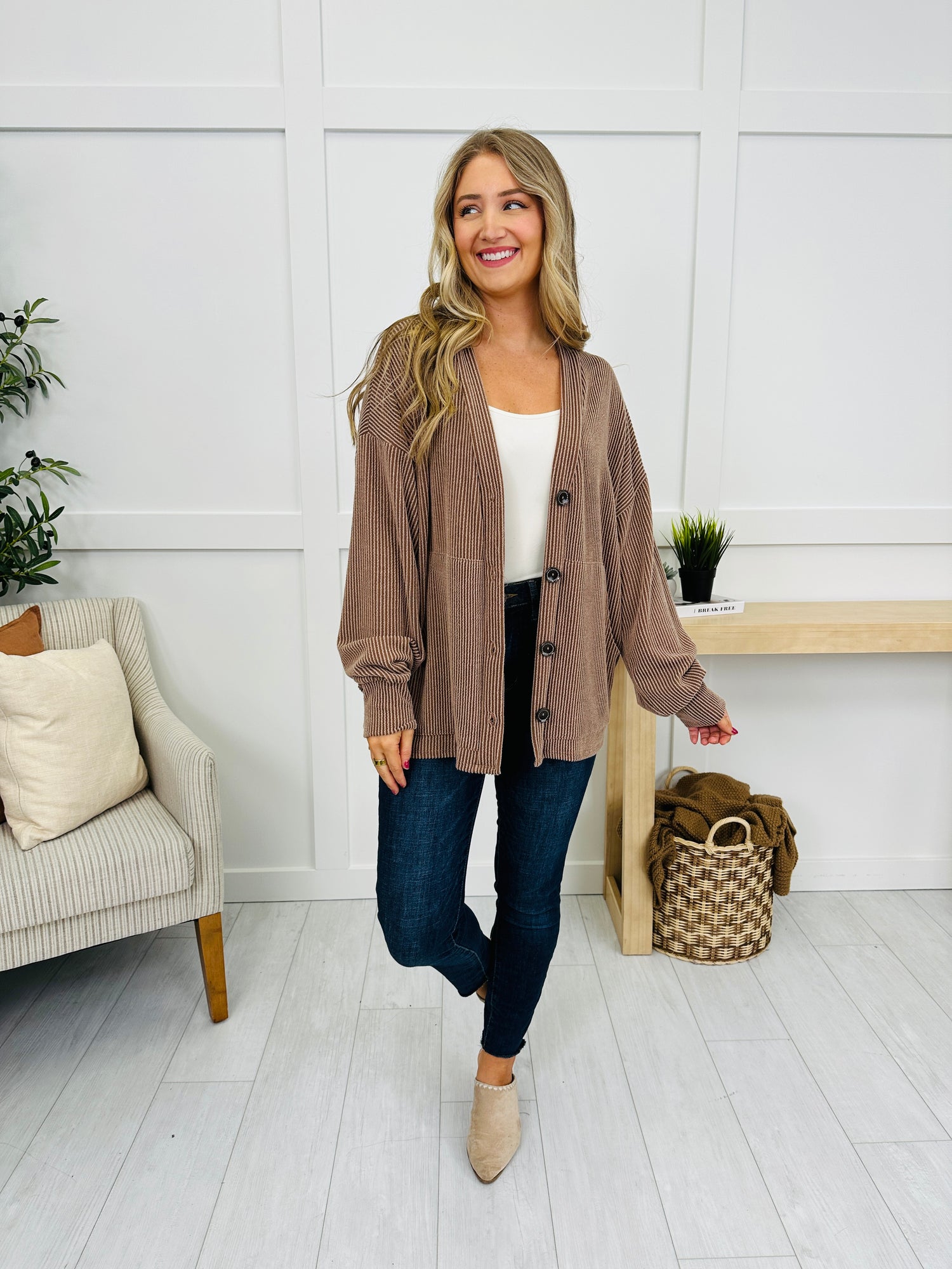 This cardigan brings an effortlessly cozy vibe with its vertical striped texture and relaxed fit. The button front design adds a classic touch, while the front pockets complete the laid-back look. Perfect for layering over your favorite tanks or tees, it’s a relaxed-fit, comfy go-to you’ll reach for again and again.