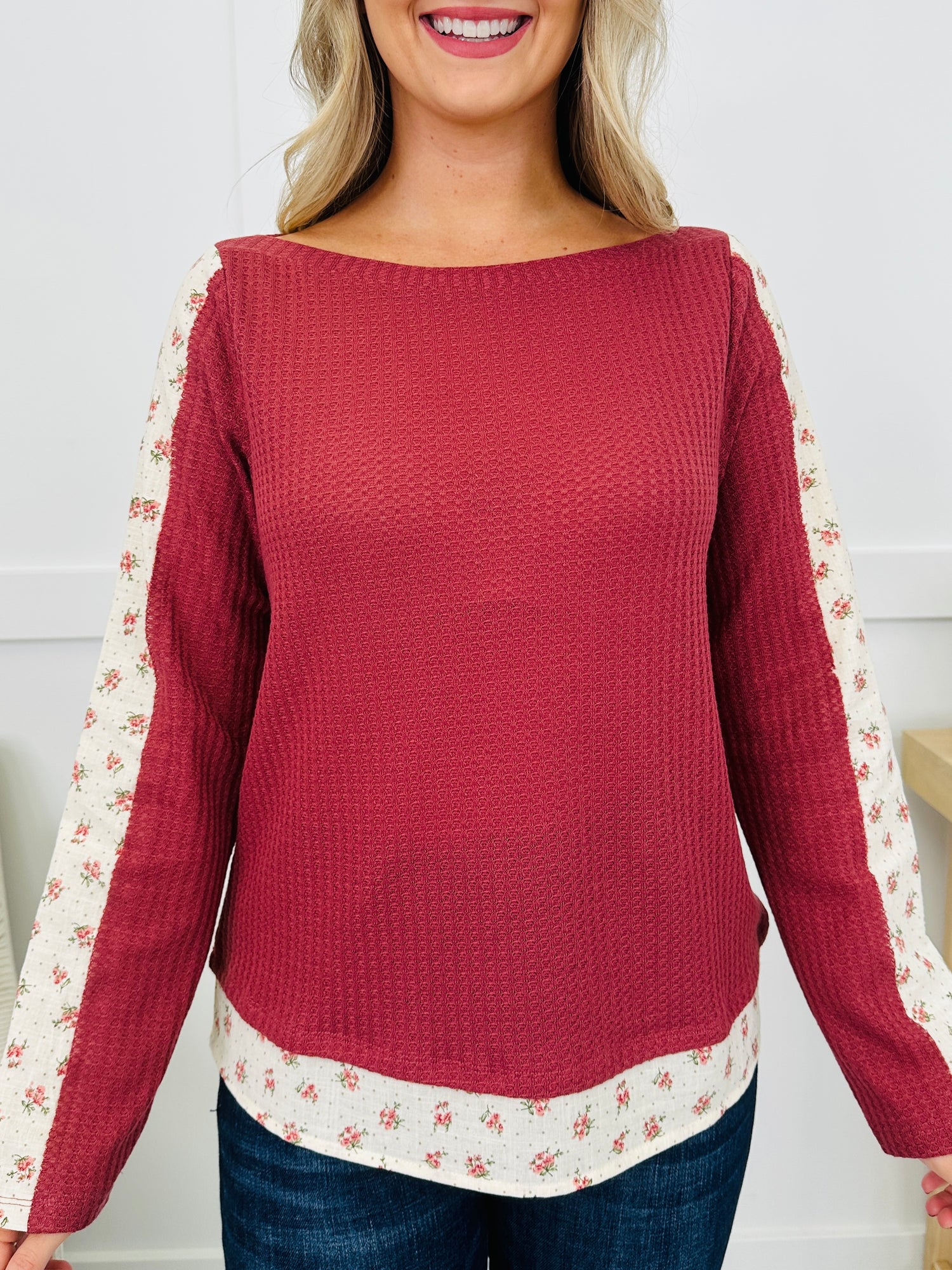 This top combines simplicity with charm, featuring a textured marsala-toned body that’s accented with floral contrast trim along the hem and sleeves. The coordinating sleeve detail adds just the right amount of character while keeping the look soft and feminine. A perfect choice for easy everyday style with a touch of personality.