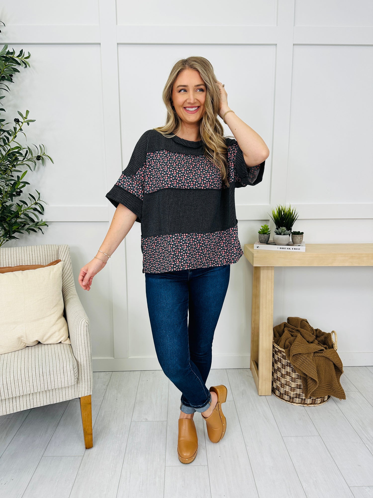This playful top blends charm and comfort with its mix of textures and patterns. Bold knit stripes pair perfectly with dainty floral prints for a fun, feminine look. The relaxed fit makes it easy to wear all day while still keeping your outfit feeling fresh and lively.