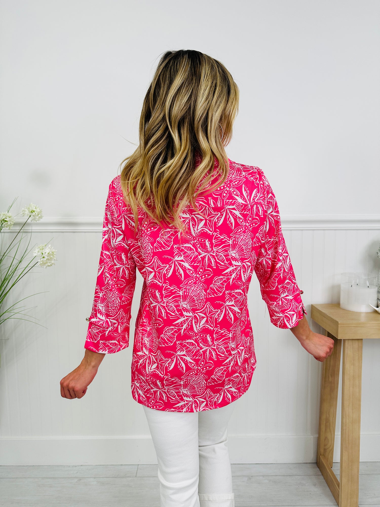 This top can be paired with jeans, white denim, or even work pants for multiple, versatile looks.  Finished with three quarter length sleeves, it’s the perfect in-between piece for transitioning into warmer days. Add this new statement top to your cart and bloom in your wardrobe this spring.