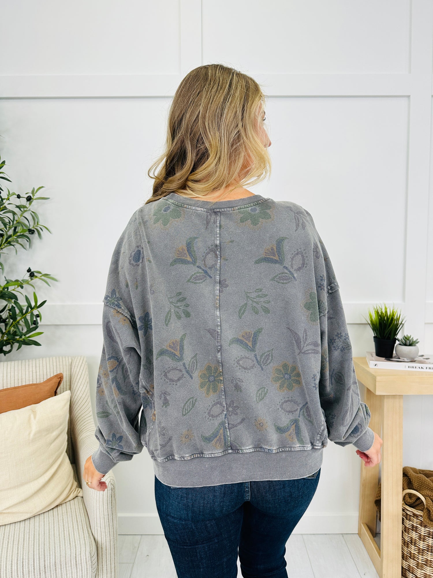This sweatshirt features a beautiful muted floral pattern that adds a touch of charm to its mineral-washed finish. The cozy, relaxed fit provides ultimate comfort for laid-back days or casual outings. The unique blend of soft fabric and fun design makes this piece a must-have for any season, offering both style and comfort.