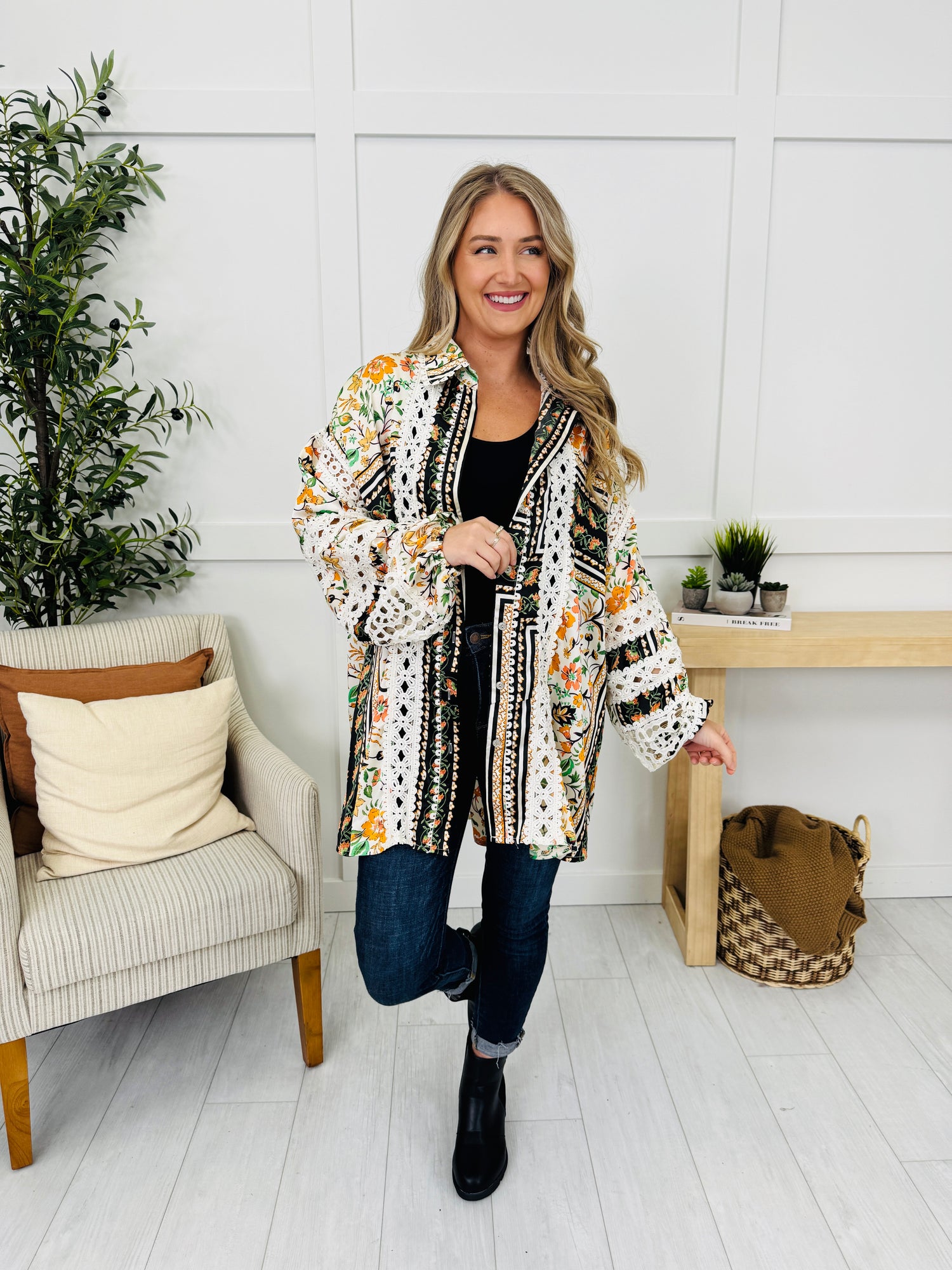 Make a statement with intricate crochet lace running down the front and across the sleeves, set against a bold mixed floral-and-stripe print. The collared button front and long sleeves keep it timeless, while the longline, curved hem offers easy coverage. Wear it buttoned or open over a simple tank for a chic layer.