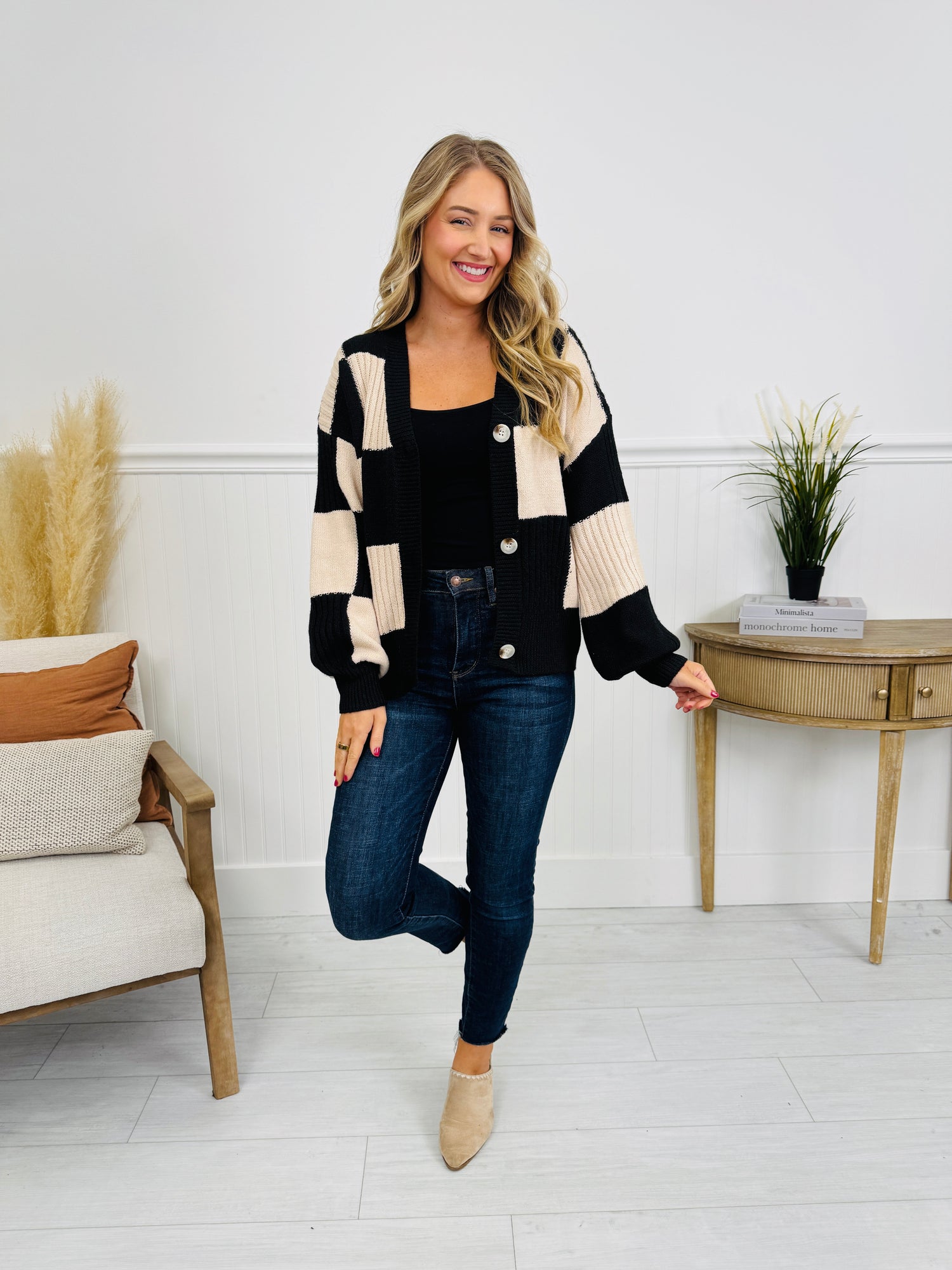 This cozy sweater offers a bold statement with its eye-catching checkerboard pattern in contrasting shades of black and beige. Featuring a flattering V-neckline and a classic large button-down closure, it combines style and comfort effortlessly. The relaxed fit and ribbed details on the sleeves and hem add a touch of texture and warmth, making it the perfect layering piece for any fall or winter wardrobe.