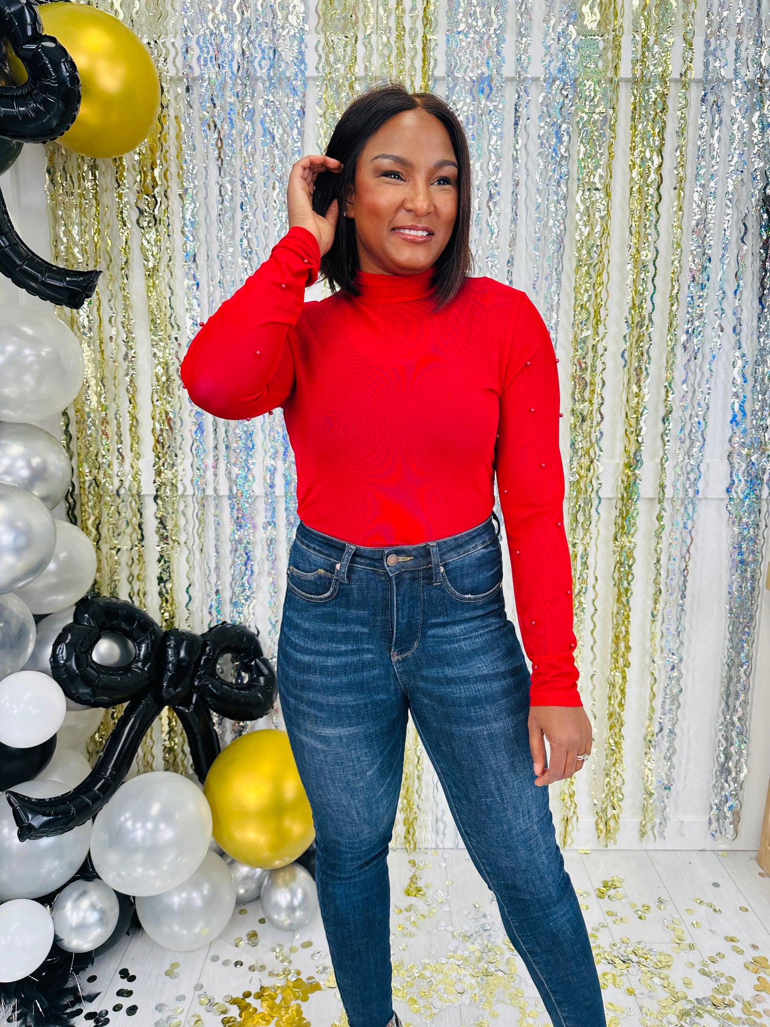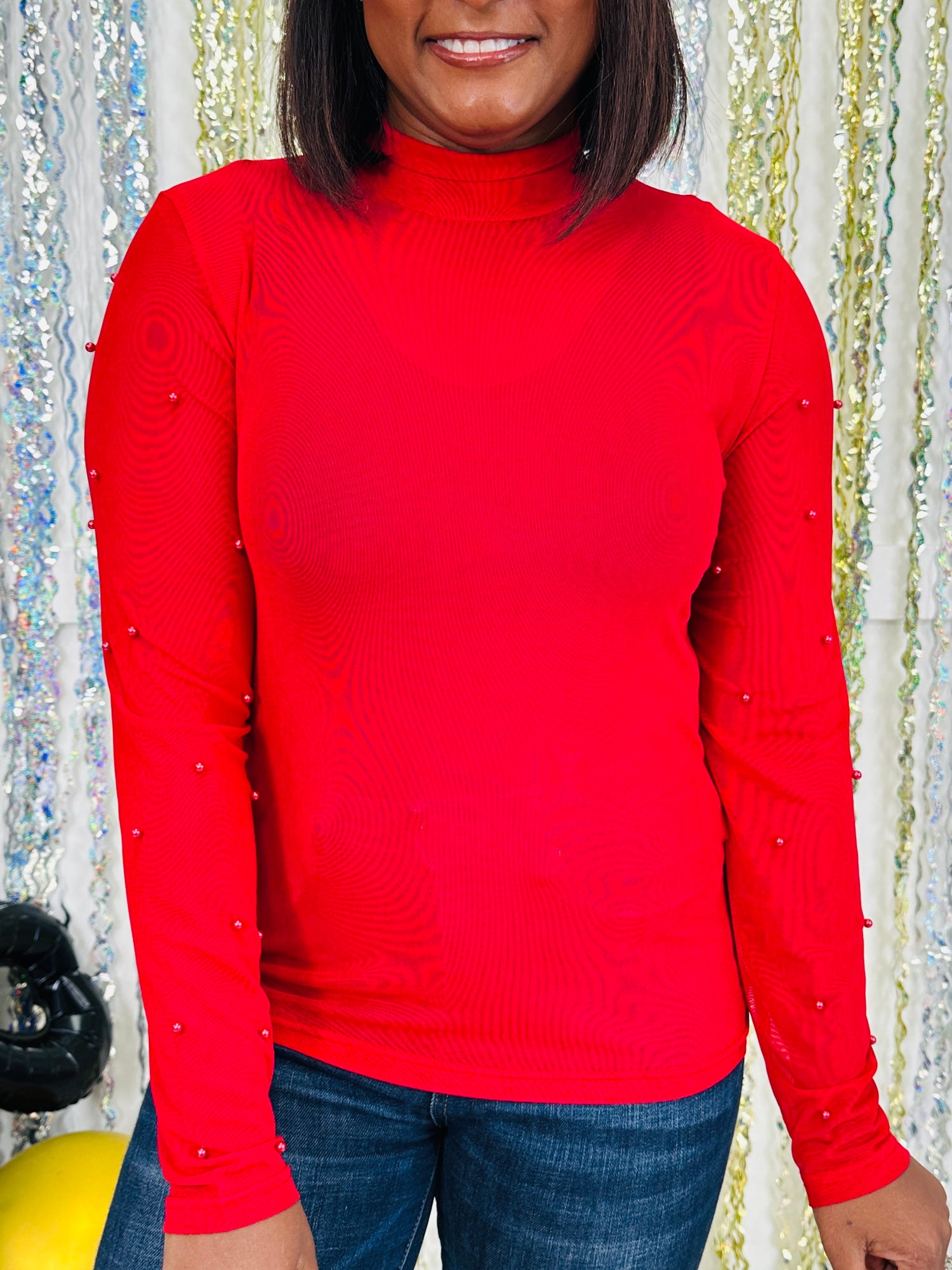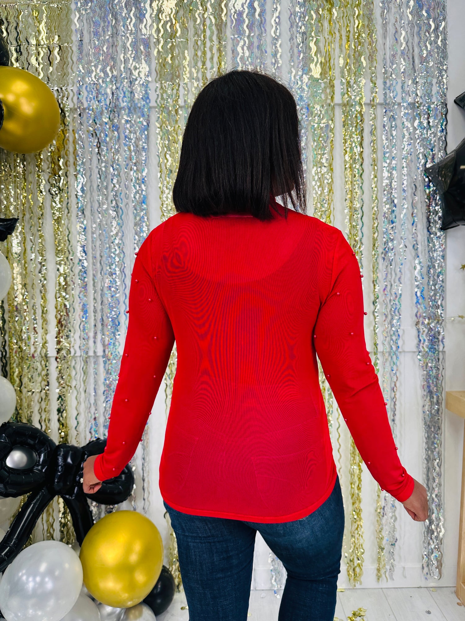 This stylish red top adds a pop of color to any wardrobe, featuring delicate matching pearl accents along the sleeves. Its form-fitting silhouette creates a flattering, streamlined look, making it perfect for layering or wearing on its own. Whether dressed up for a night out or styled casually, this top effortlessly combines elegance with comfort for a versatile addition to your collection.