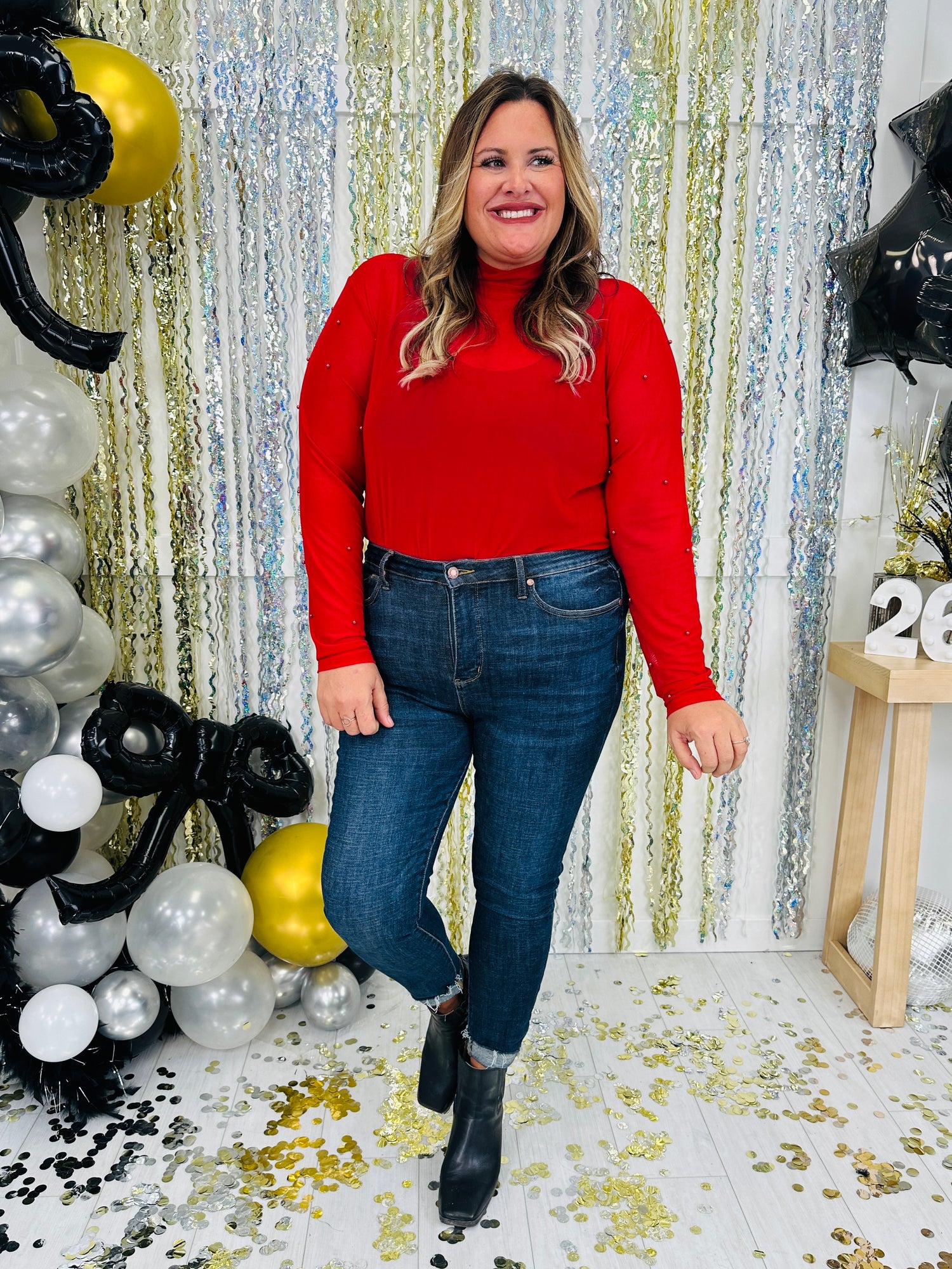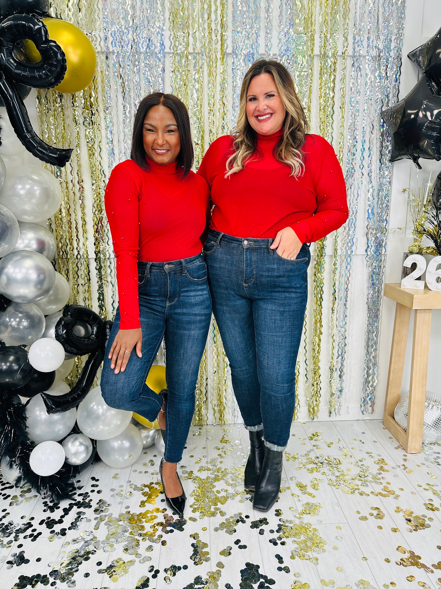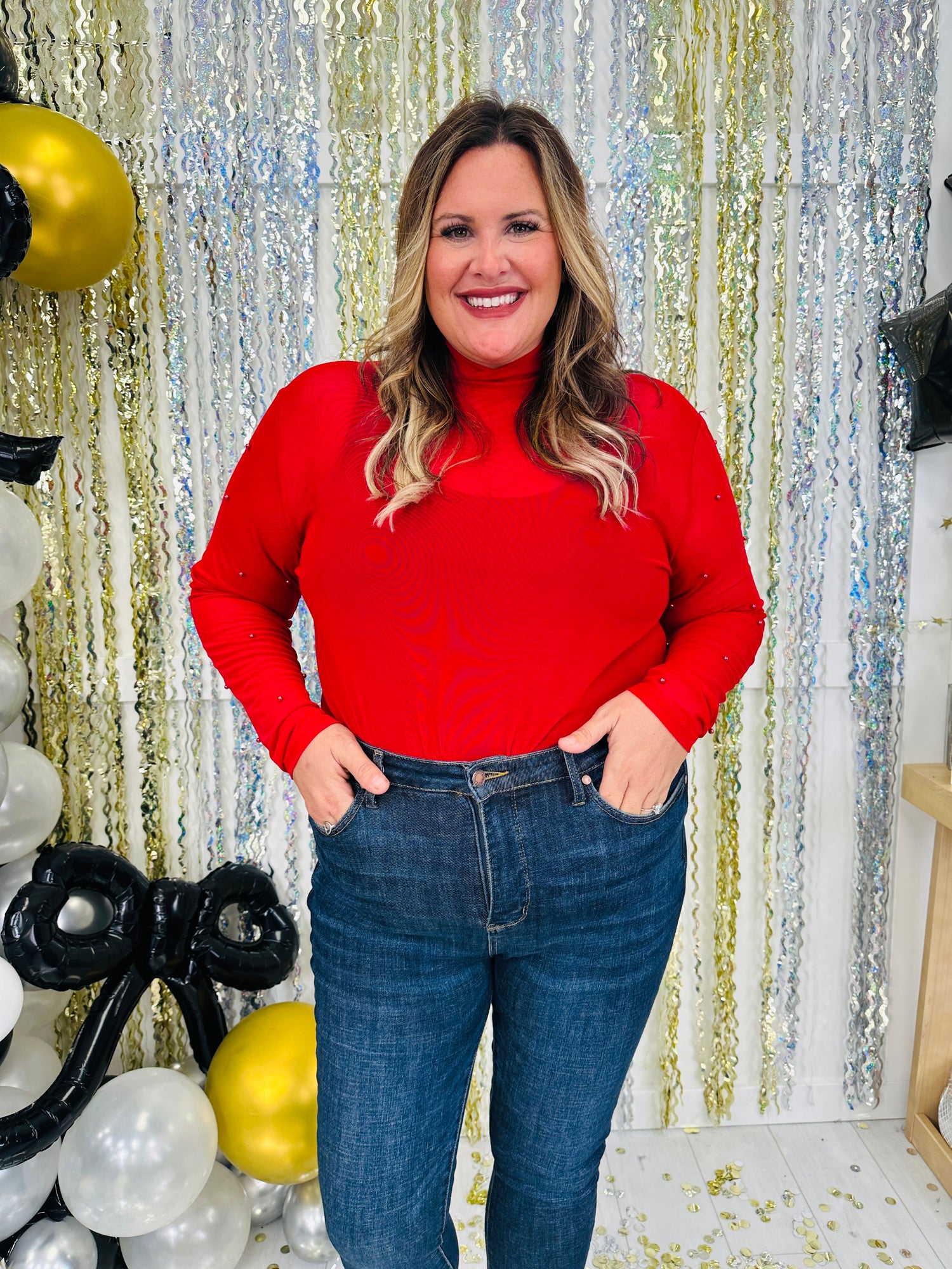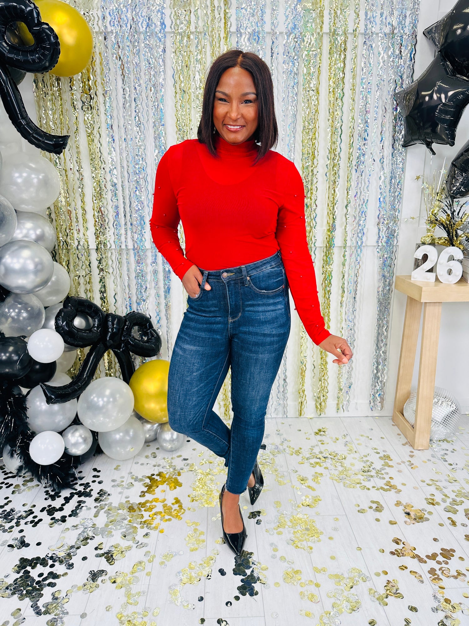 This stylish red top adds a pop of color to any wardrobe, featuring delicate matching pearl accents along the sleeves. Its form-fitting silhouette creates a flattering, streamlined look, making it perfect for layering or wearing on its own. Whether dressed up for a night out or styled casually, this top effortlessly combines elegance with comfort for a versatile addition to your collection.