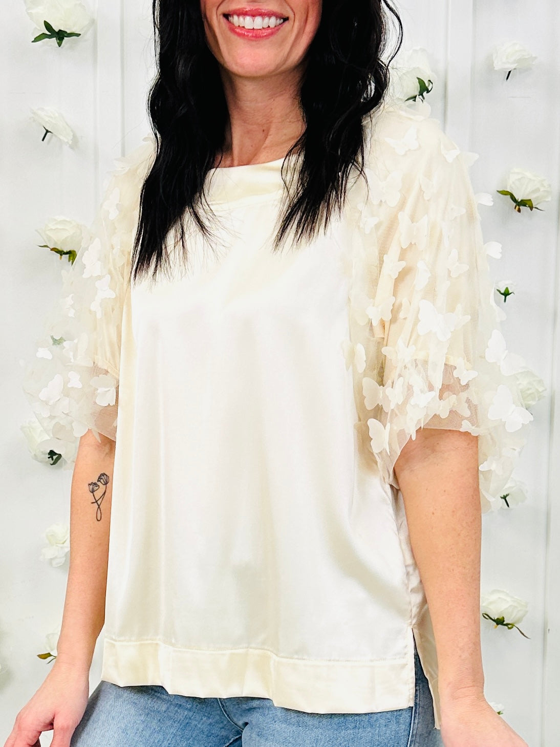 This top is a beautiful mix of soft elegance and statement-making detail. The silky woven body creates a smooth, flattering drape while the round boat neckline keeps the look polished and timeless. The standout butterfly mesh sleeves add airy texture and dimension, giving the top a delicate, eye-catching finish. Designed with a relaxed flowy fit and side slits, this piece pairs effortlessly with denim or dressier bottoms when you want something feminine, unique, and easy to style.