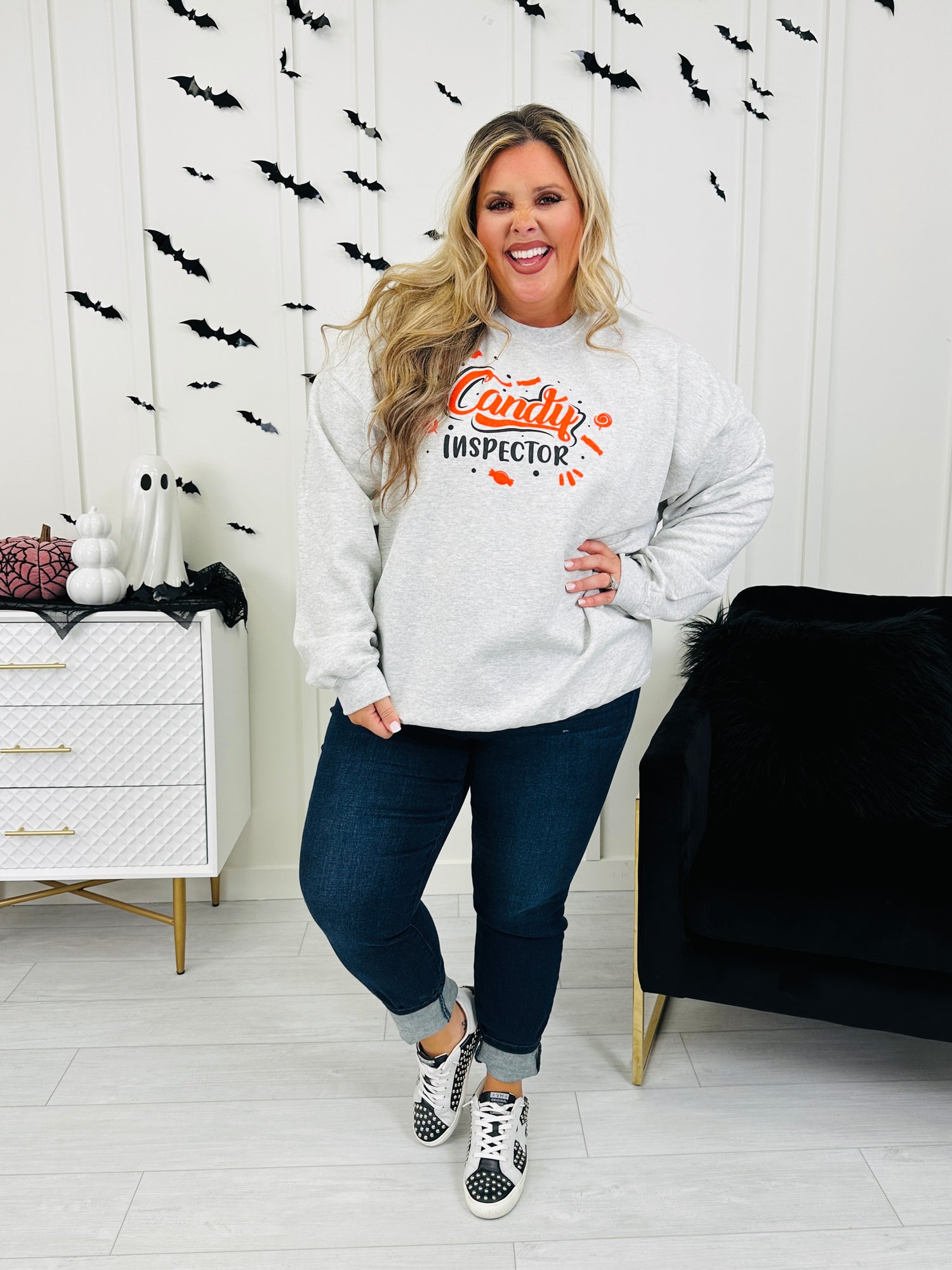 [message]Because someone has to make sure the treats are safe! ;) Featuring a bold screen printed design in festive orange and black, this playful sweatshirt is a must-have for all your Halloween fun. This sweatshirt is buttery soft and cozy and it’s designed with an oversized and relaxed fit that flatters every body type. Perfect to wear with jeans or leggings, this crewneck is ideal for Halloween night, fall outings, or lounging in comfort while enjoying your candy haul.