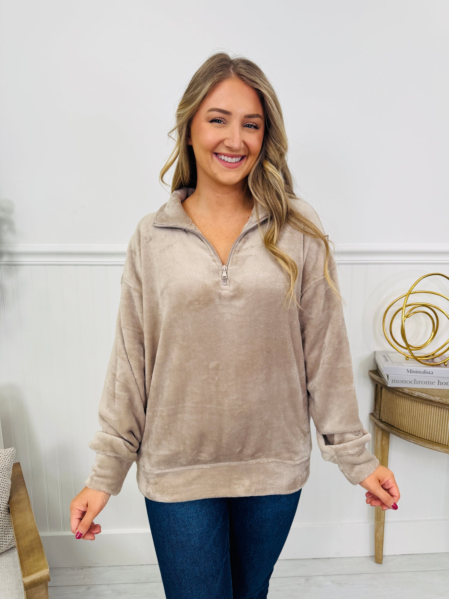 Wrap yourself in comfort with this plush quarter-zip pullover, available in several neutral shades perfect for everyday wear. The soft, velvety texture gives it a warm and luxurious feel, while the relaxed fit adds to its easygoing charm. Whether you’re lounging at home or heading out for a casual day, this piece combines effortless style with all-day coziness.