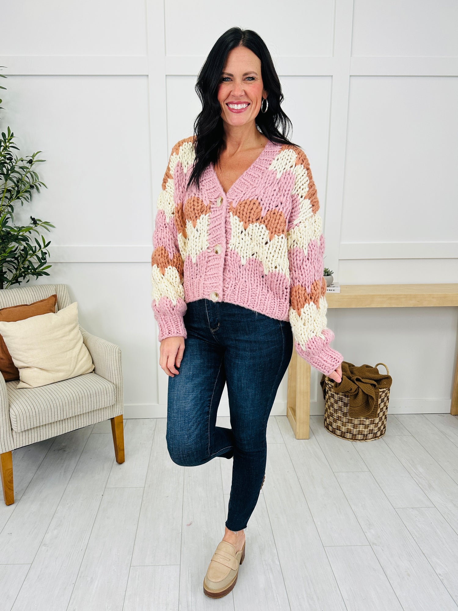 Bring a dose of playful charm to your wardrobe with this cozy cardigan. Its chunky knit texture and colorblock heart pattern make it a standout piece, while the three-button front adds a classic touch. Perfect for layering or wearing on its own, this cardigan is sure to become your go-to for adding a sweet and stylish vibe to any look.