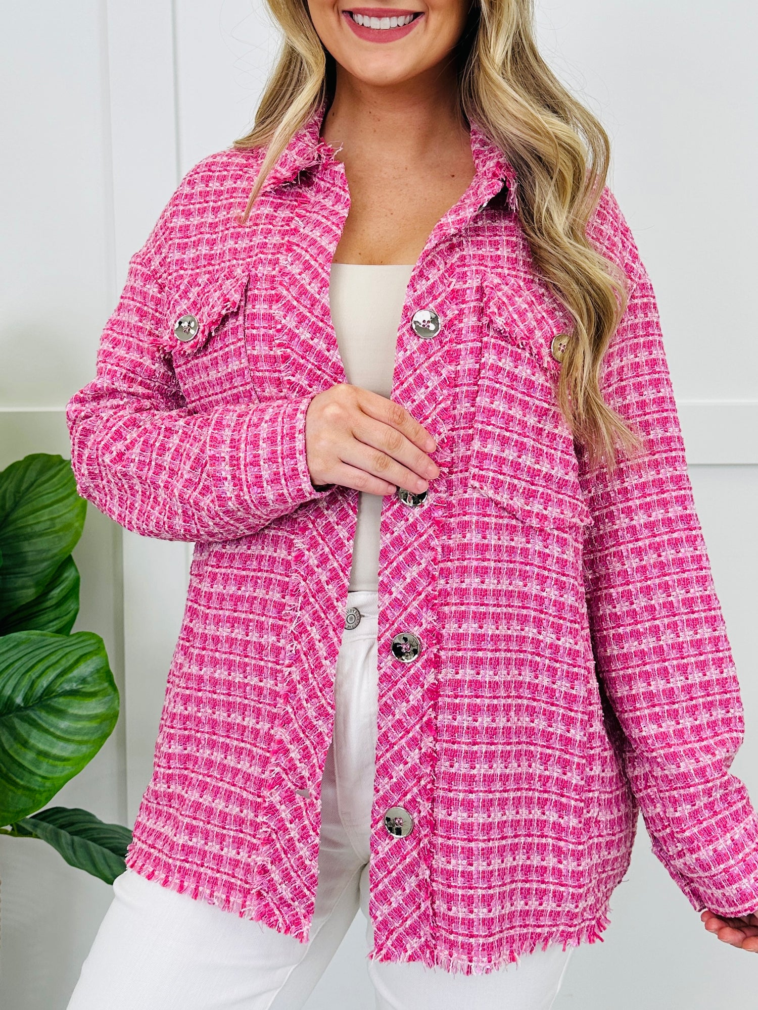 This woven beauty brings instant polish with a bold textured pattern that feels elevated and fun. The frayed edge trim adds that boutique-chic finish, while the shiny button front gives it a dressed-up touch you can wear day or night. Finished with flap chest pockets and an easy layering fit, it’s the kind of statement piece that makes even your simplest basics look styled in seconds.