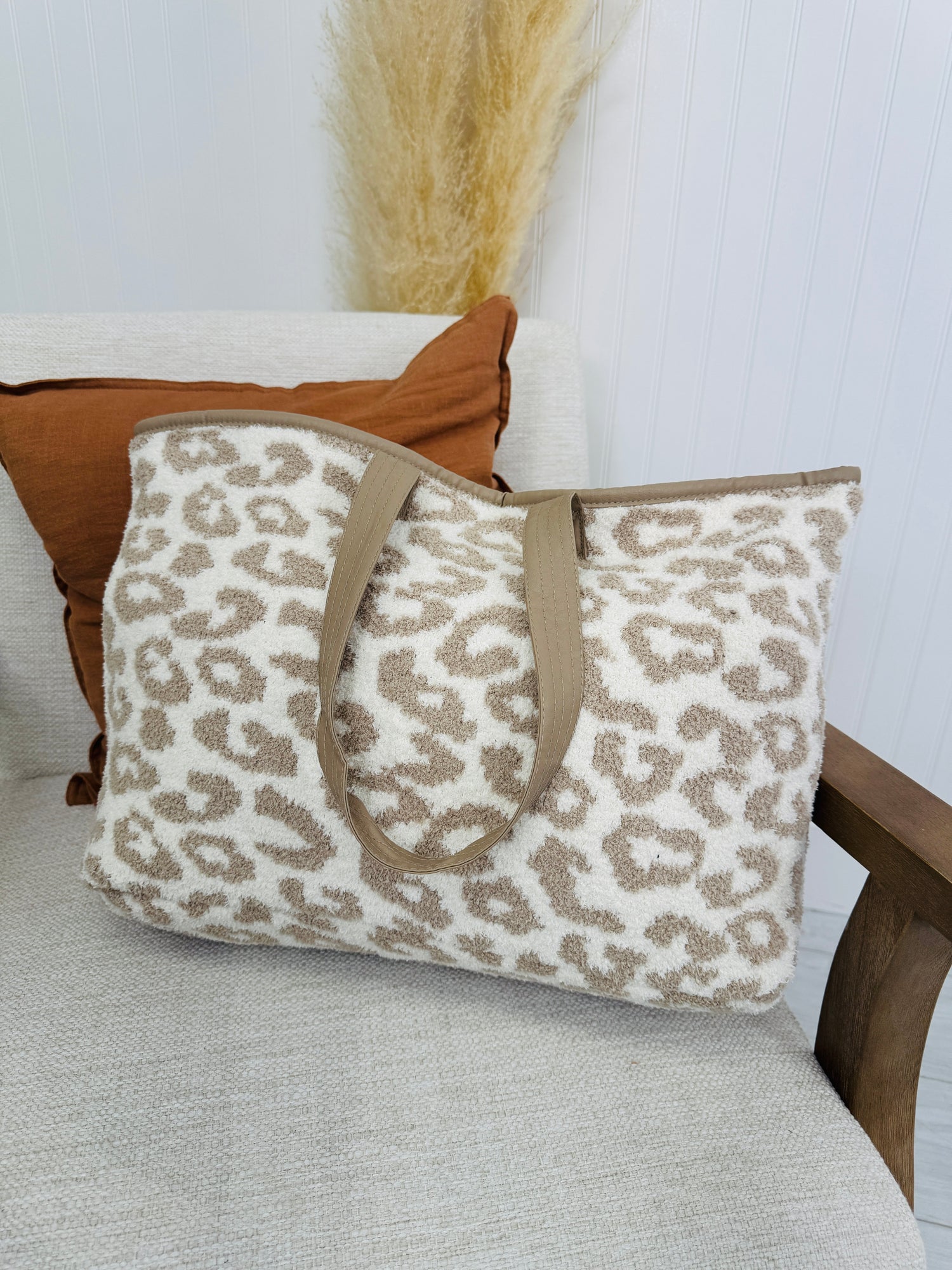 These cozy and stylish tote bags feature a plush, textured leopard print that adds a fun twist to your everyday essentials. With sturdy straps and a spacious interior, these bags offer both fashion and function for all your on-the-go needs. Available in versatile neutral tones, they're perfect for casual outings or running errands.