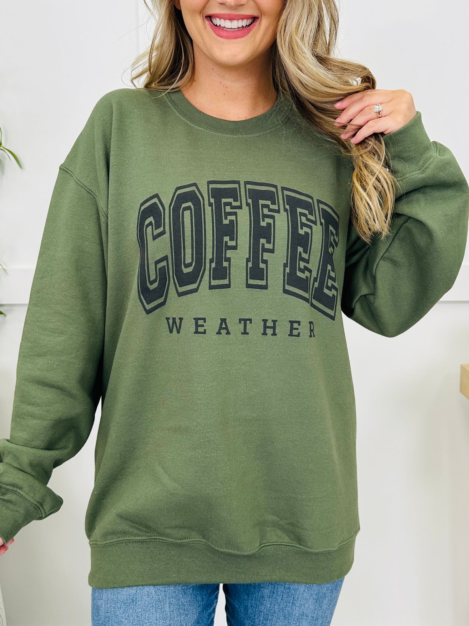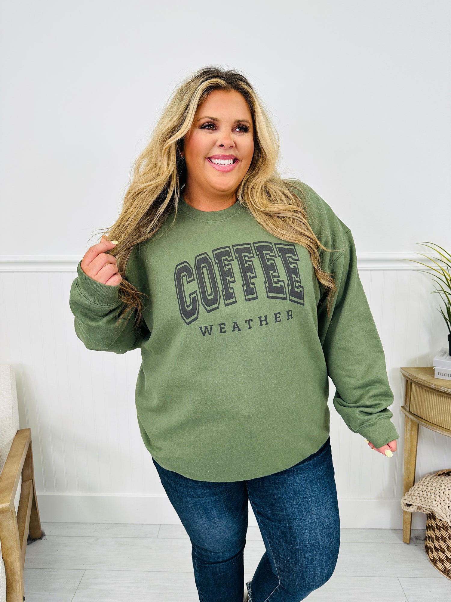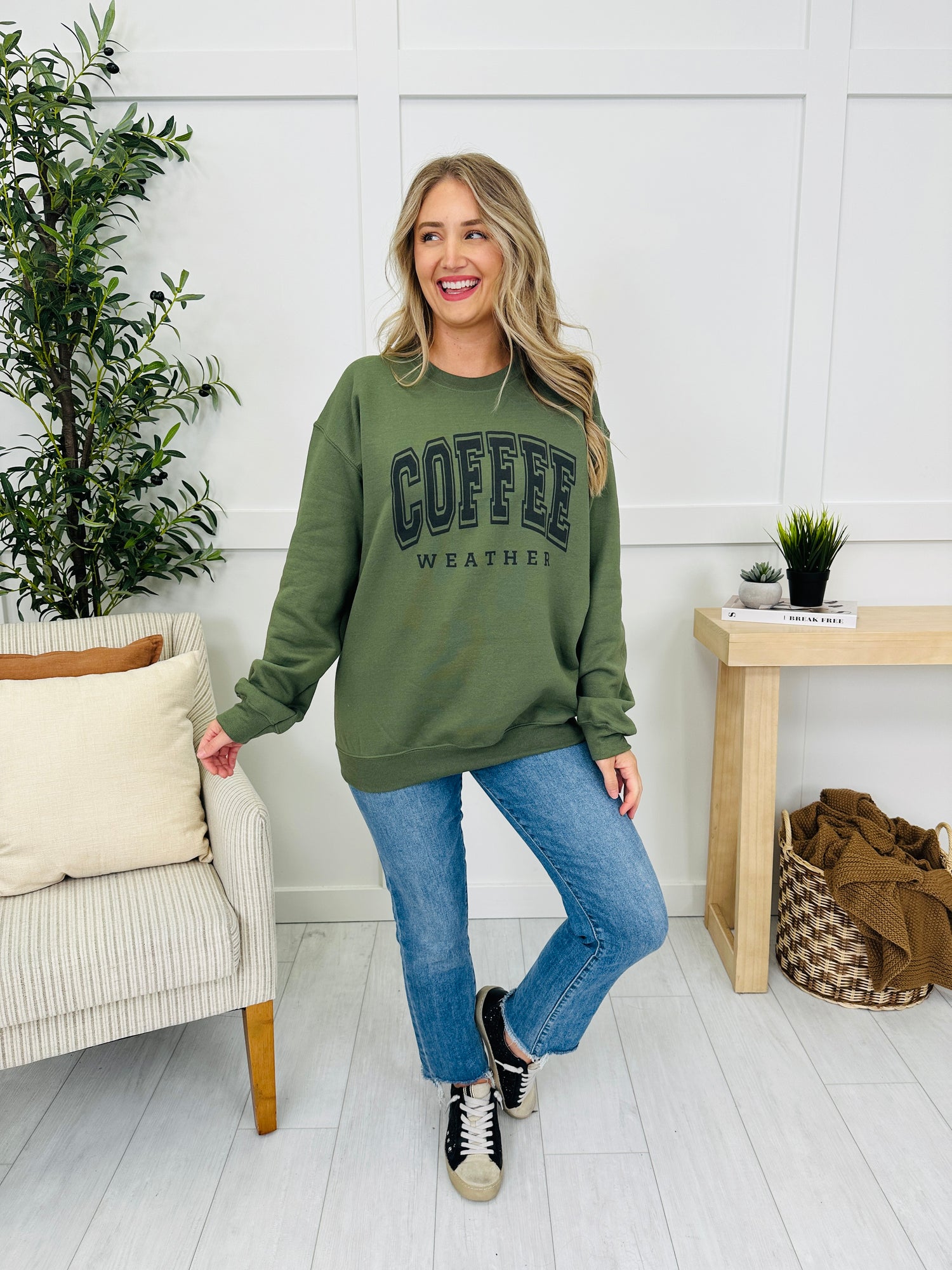 Our best selling crewneck is now available in a new color! Start your day in the most delicious way with this ultra-cozy Coffee Weather crewneck in a new, gorgeous olive color. Designed with classic collegiate block lettering and a soft, relaxed fit, it's the ultimate go-to for brisk mornings and latte runs. This crewneck is screen printed in house for long lasting wear. Whether you're lounging at home or sipping your favorite brew on the go, this sweatshirt is a warm hug in wearable form—just add coffee!