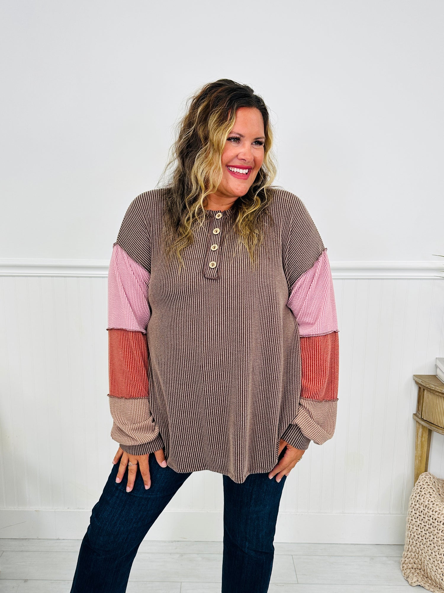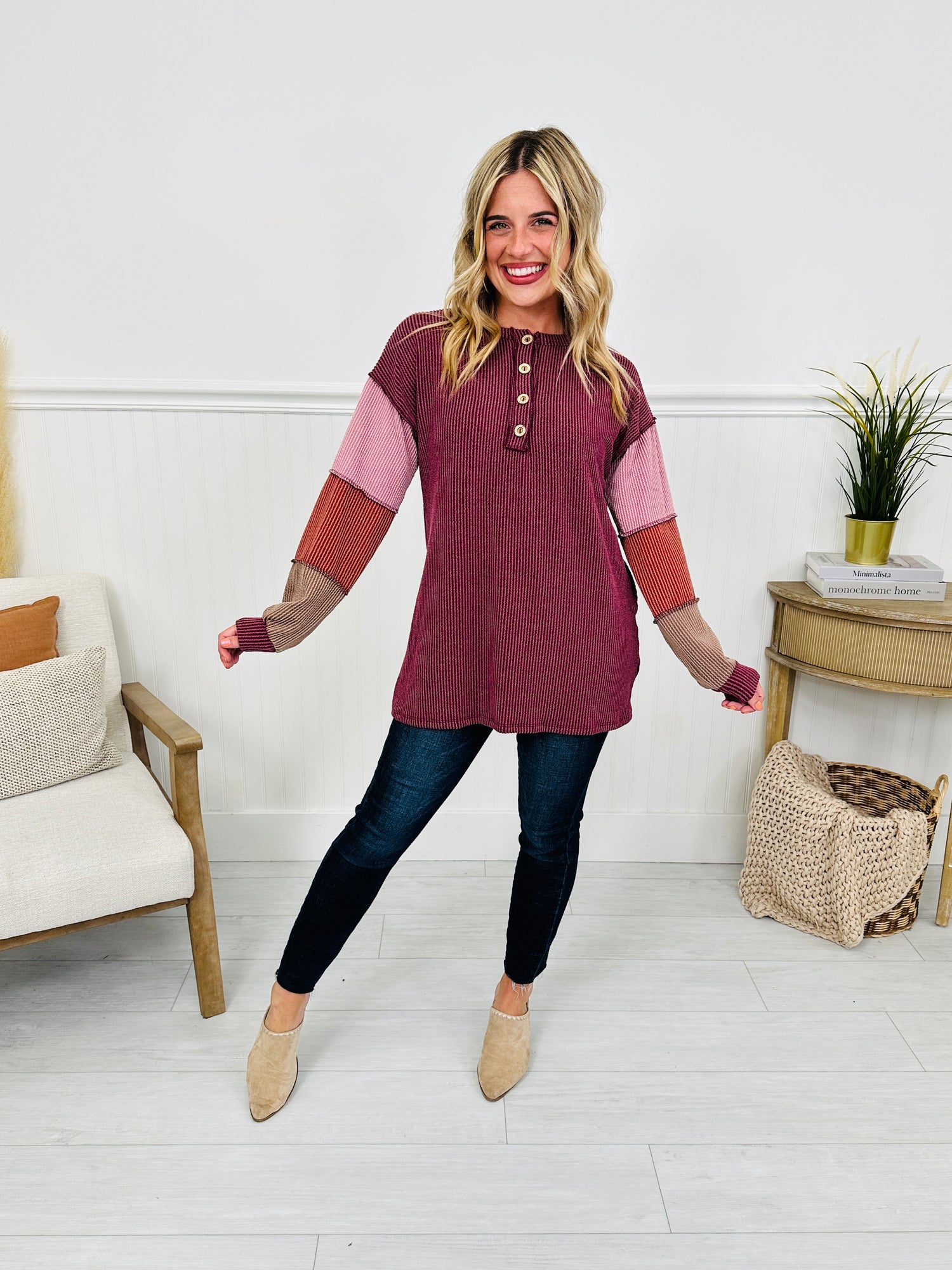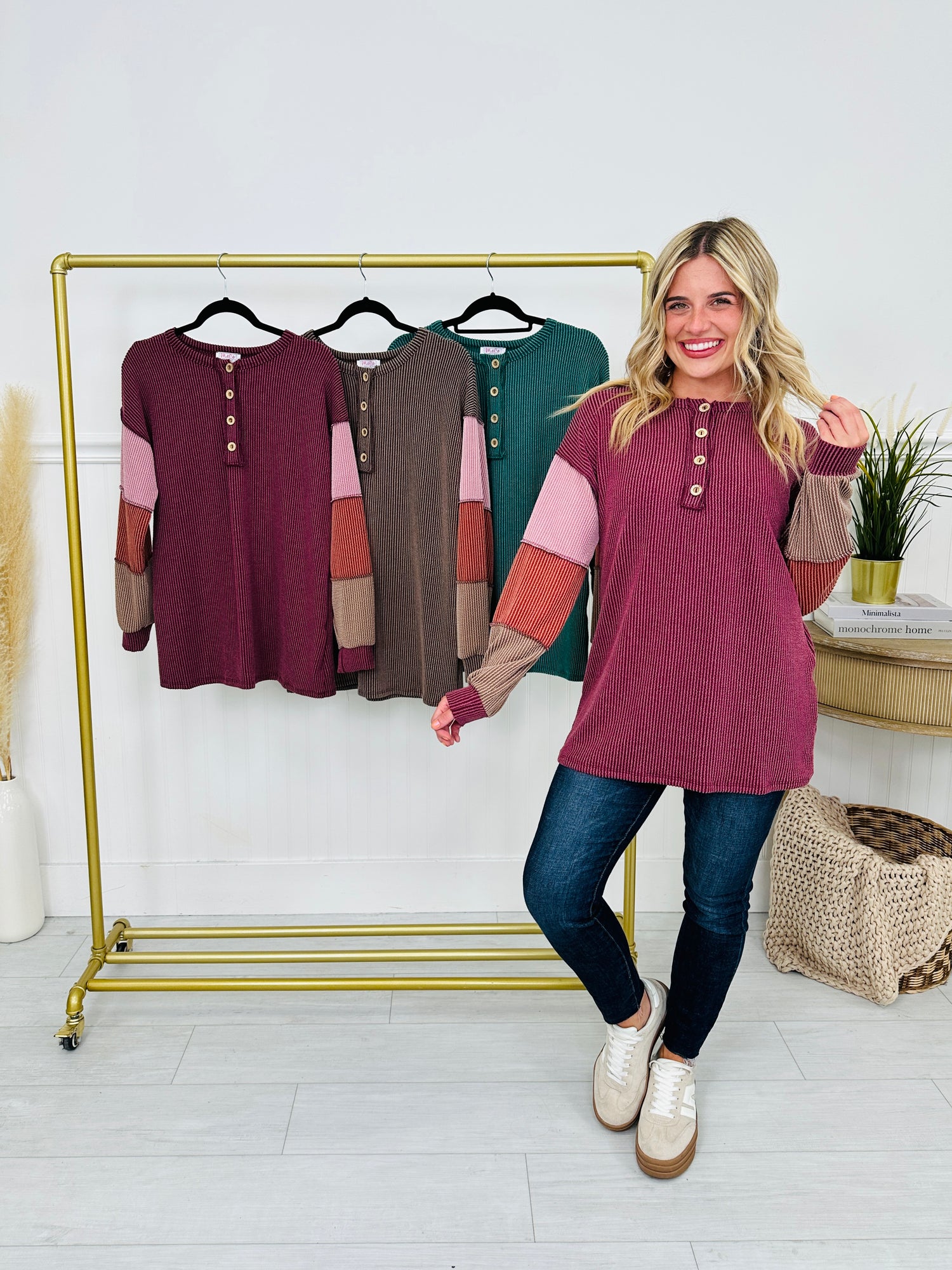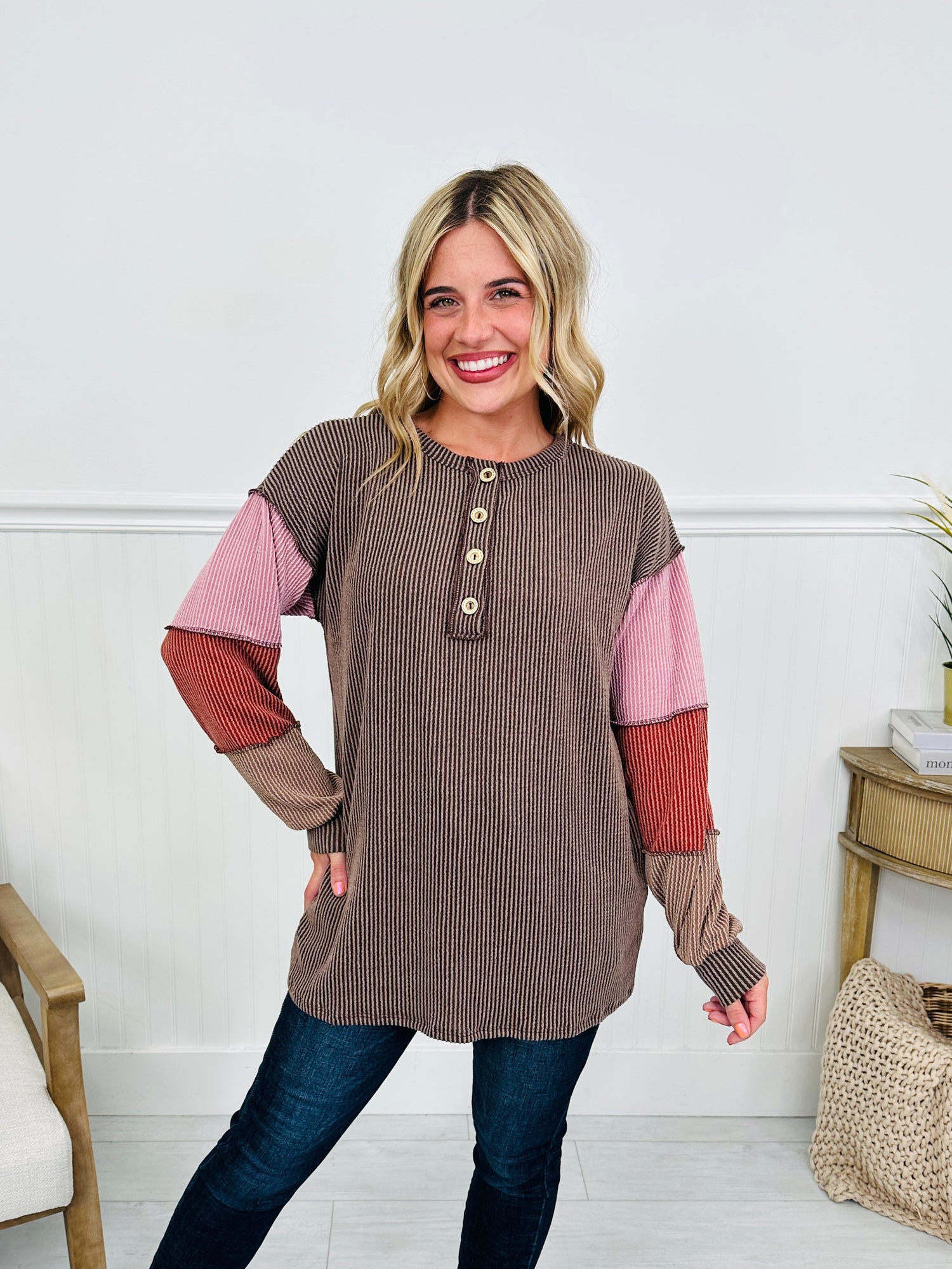 This new arrival is perfect for the cooler days that lie ahead. This top is made from our best selling raised rib material that is buttery soft, stretchy, and so comfortable. We love the color blocks on this top in every single color. Each combination gives the cutest fall vibes.