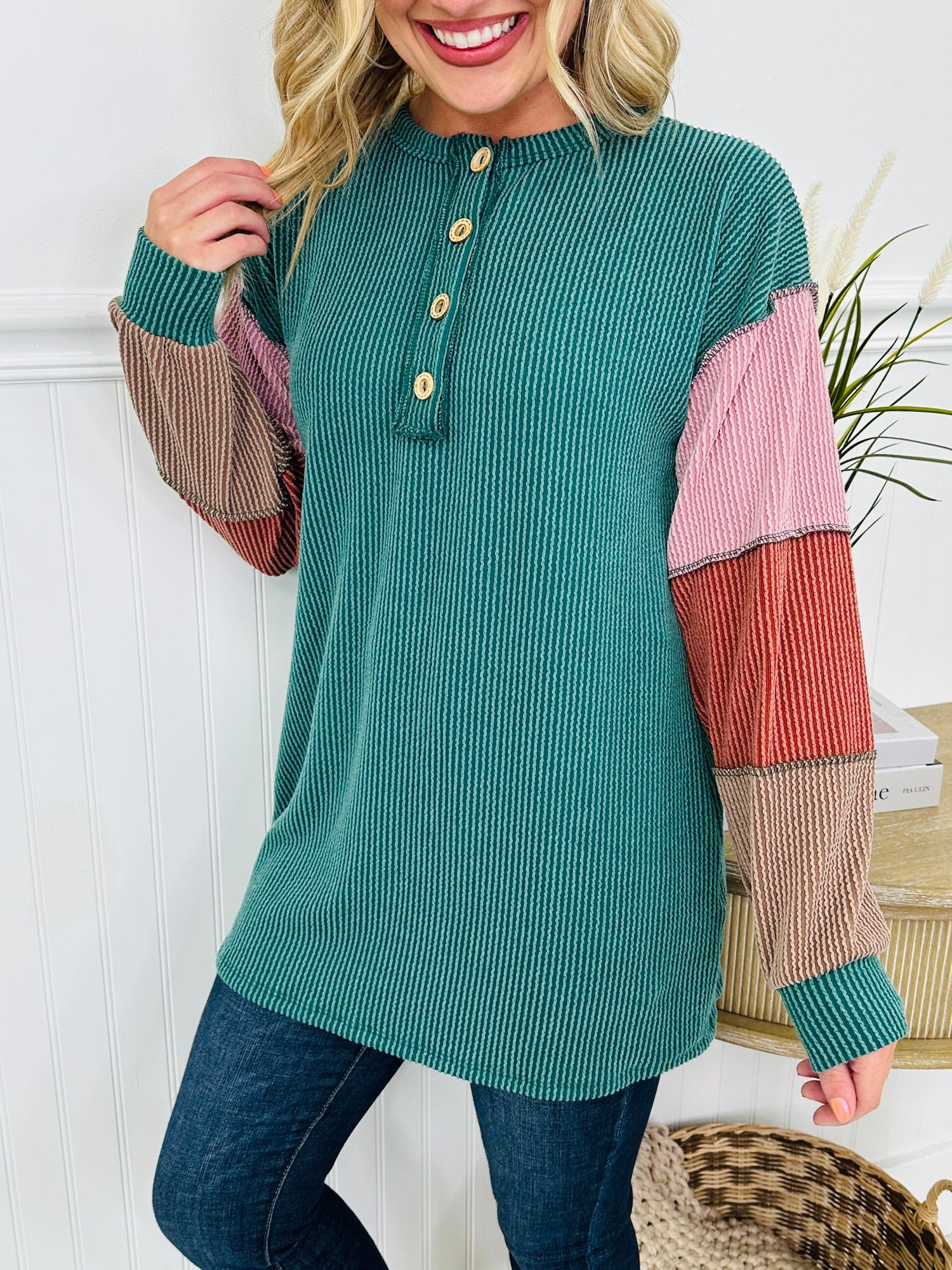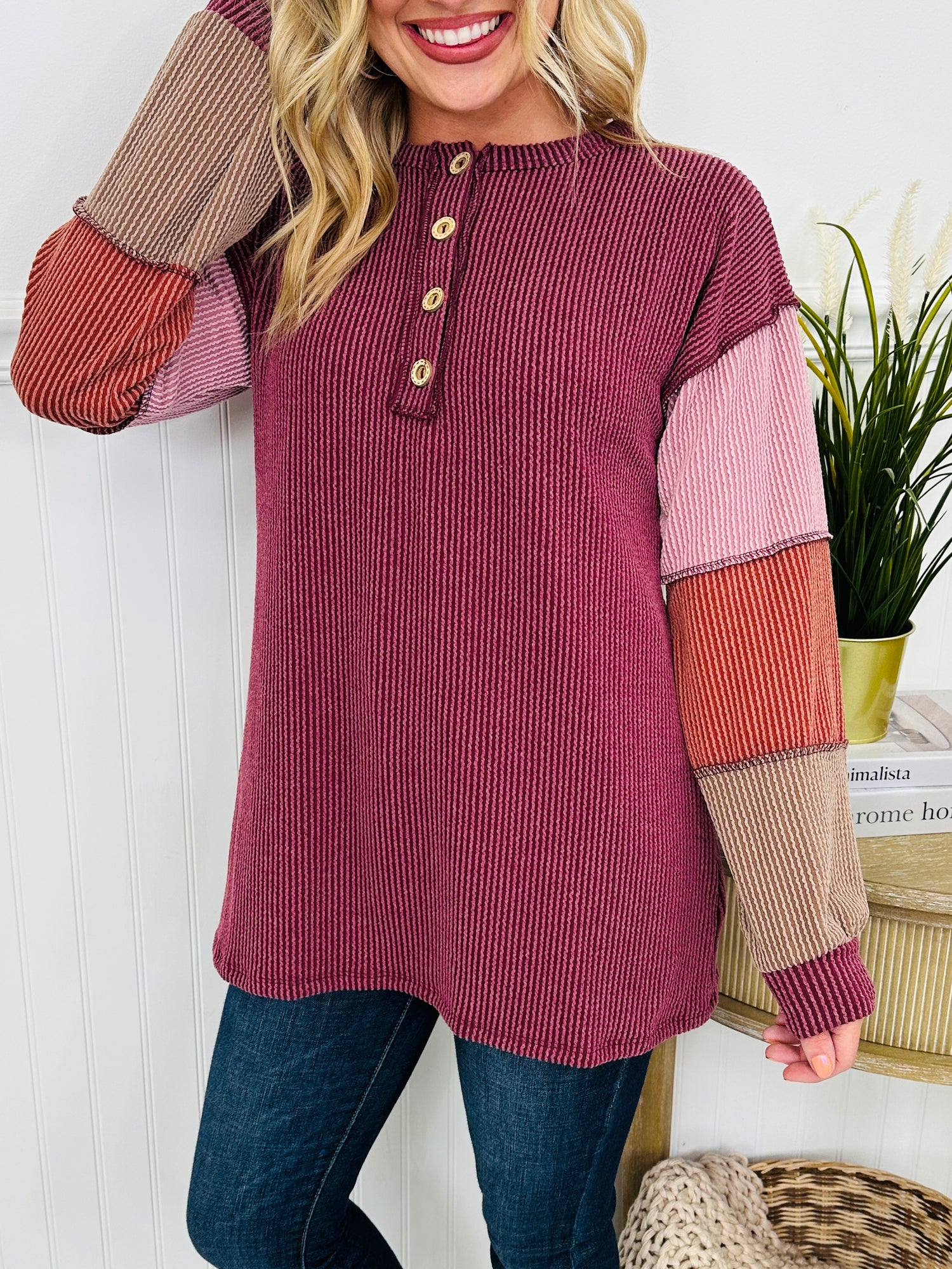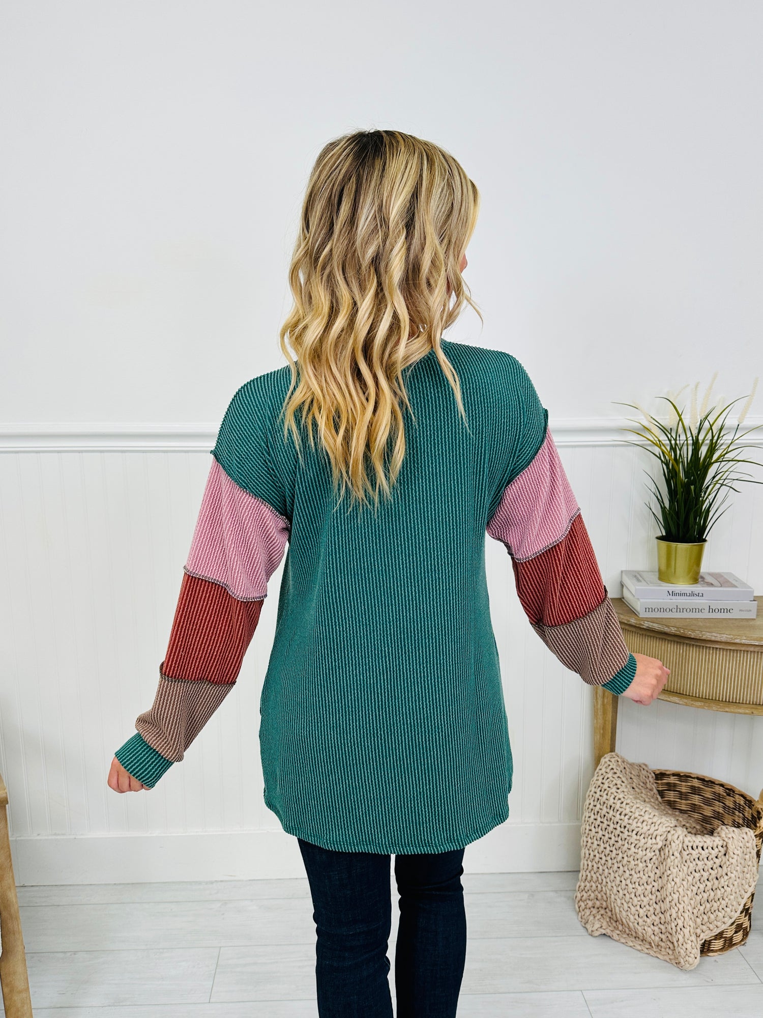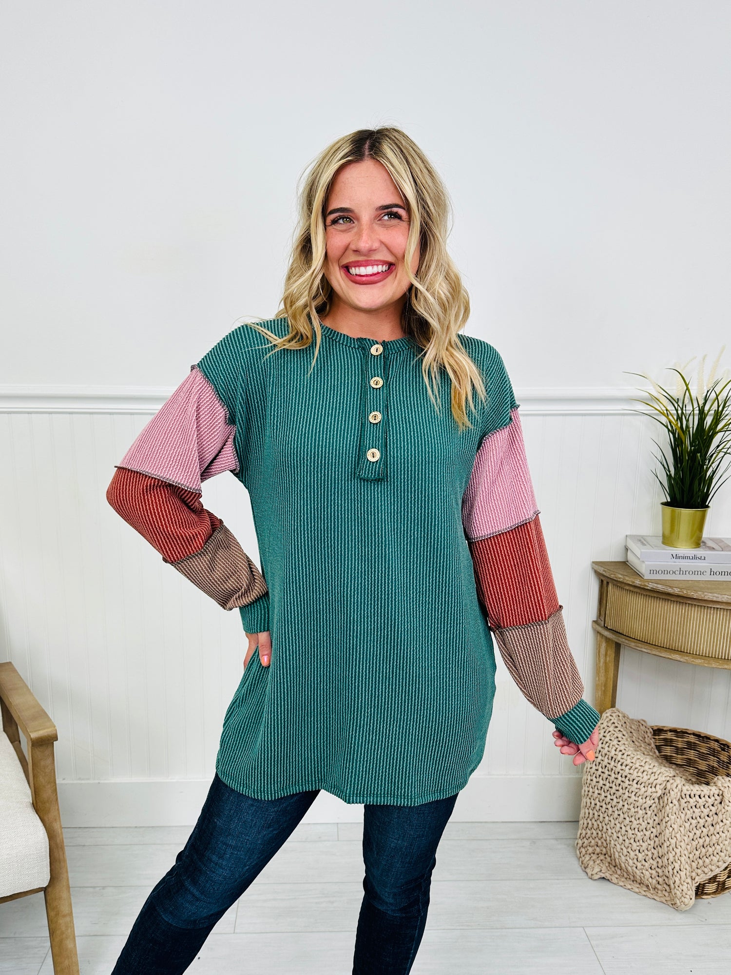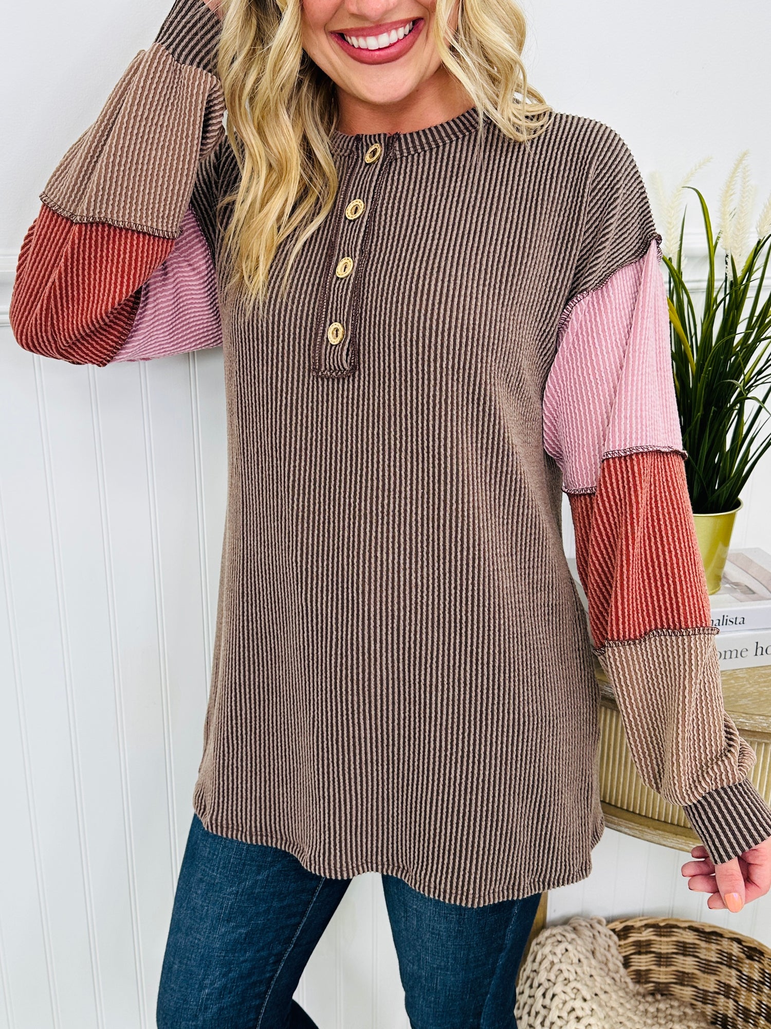 This new arrival is perfect for the cooler days that lie ahead. This top is made from our best selling raised rib material that is buttery soft, stretchy, and so comfortable. We love the color blocks on this top in every single color. Each combination gives the cutest fall vibes.