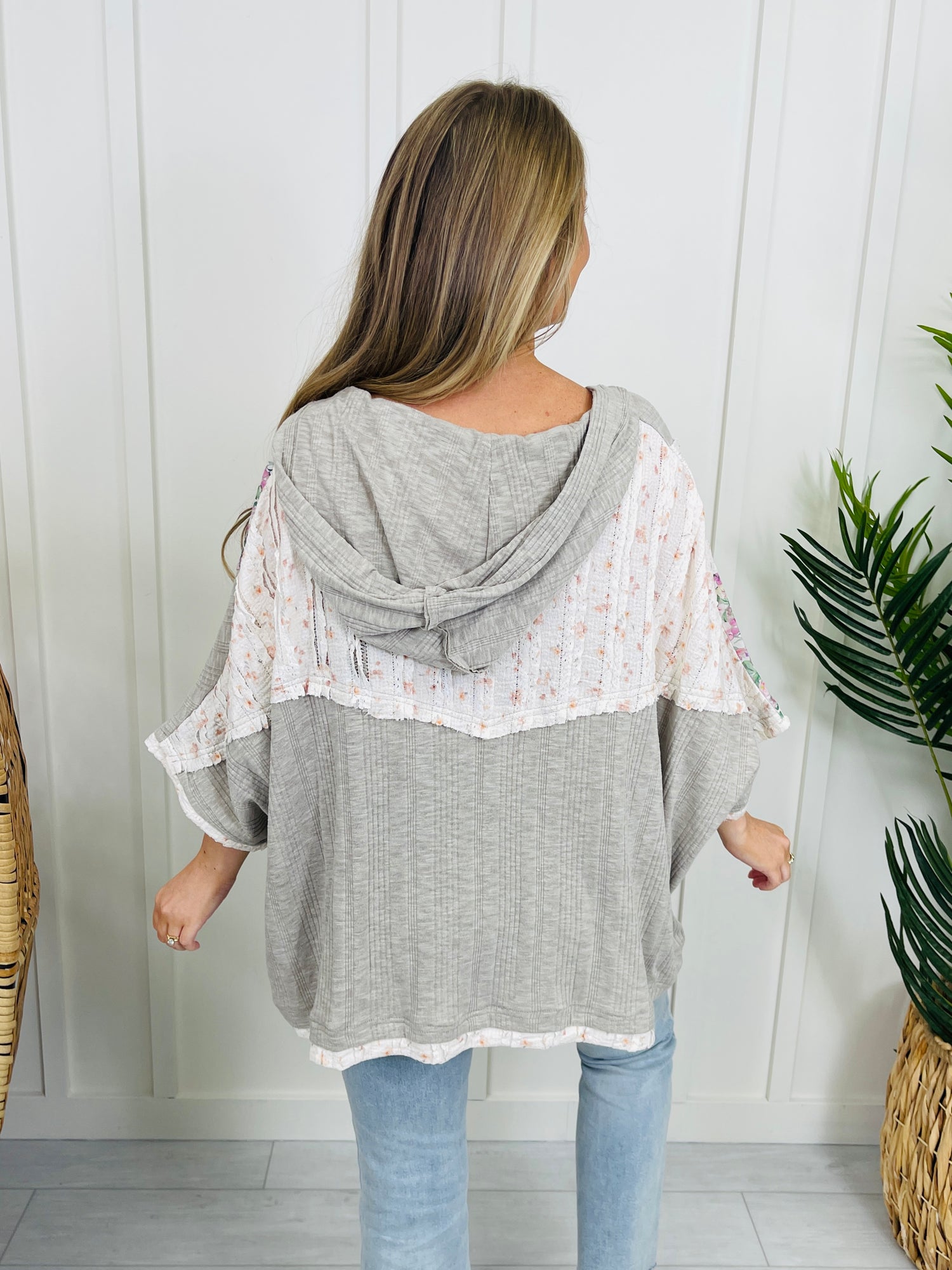This hooded top is such a fun statement piece with its floral star appliqué front and center and the prettiest mix of contrast prints throughout. The V-neckline keeps it casual and easy, while the mixed-print panels give it that boho-chic look that feels trendy without trying too hard. Just throw it on with your favorite denim for an effortless outfit that still makes a statement.