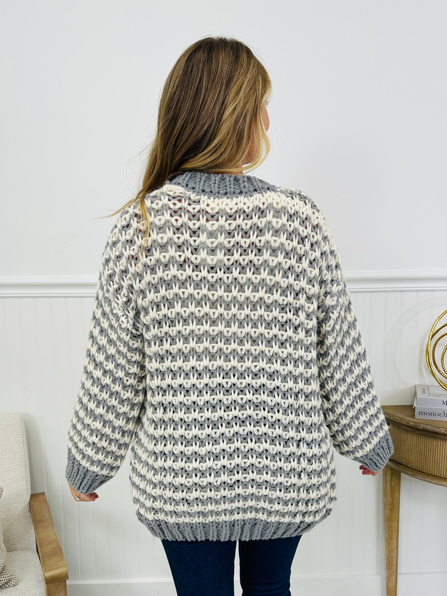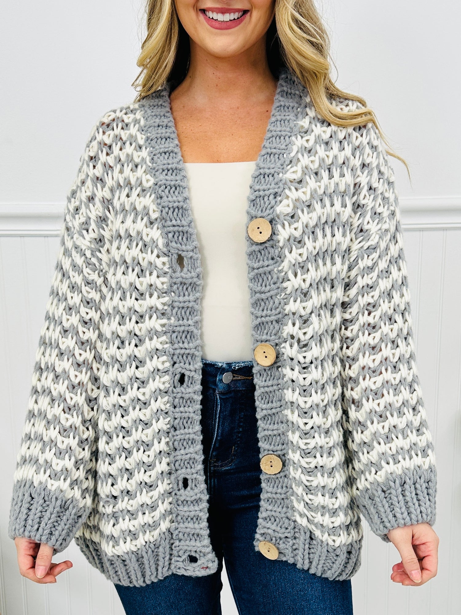 This cardigan brings all the cozy vibes with its chunky knit texture and softly relaxed silhouette that drapes effortlessly over any outfit. The wooden button closure adds a charming, natural touch, while the thick ribbed trim frames the open weave beautifully. It’s a standout layering piece that blends warmth, comfort, and style in the easiest possible way.