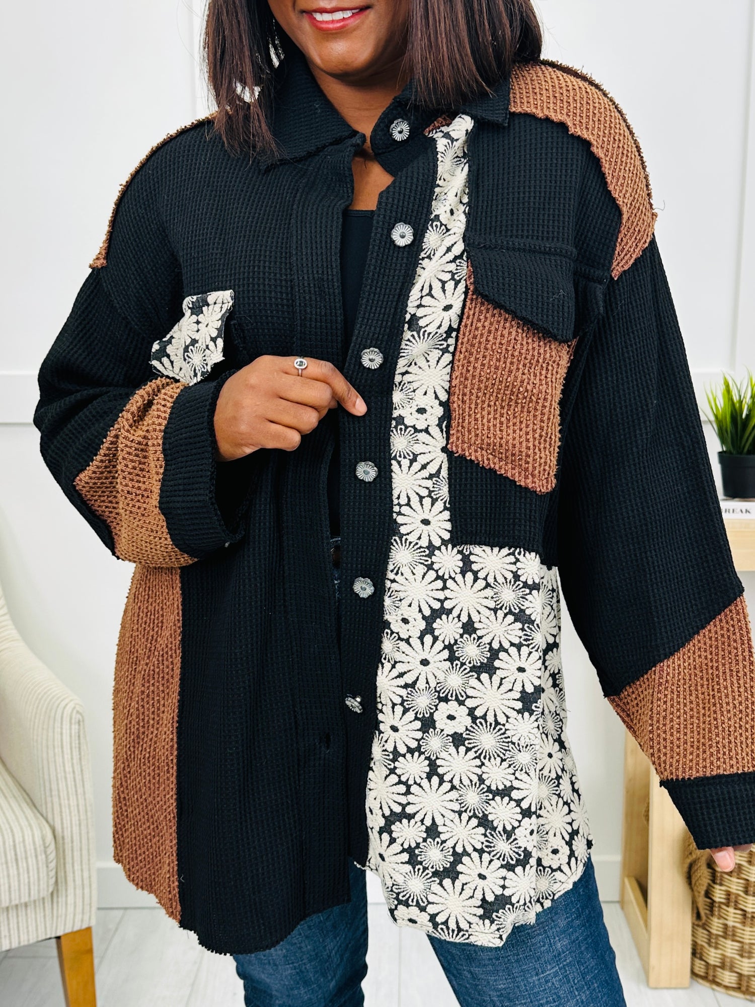This top brings cozy texture and unique detail together in the best way! The mixed textured panels add depth and dimension, while the floral accent trim gives it a playful, feminine twist. Finished with a button-down front and roomy sleeves, this piece is perfect for layering and adding a touch of charm to any outfit.