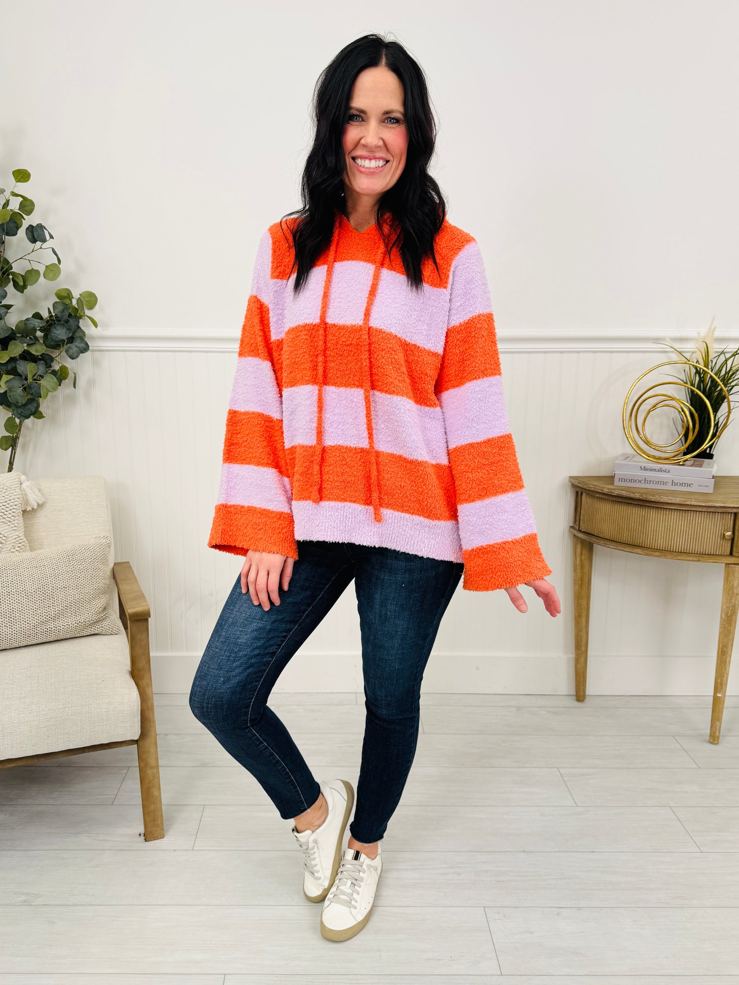 This playful hoodie stands out with its bold color-blocked stripes, bringing a fun pop to any casual outfit. The soft, textured feel gives it that plush, cozy comfort you’ll want to live in, while the relaxed hoodie fit keeps it effortlessly easy to throw on. Finished with a loose drawstring hood and roomy sleeves, it’s the perfect blend of cheerful style and everyday comfort.