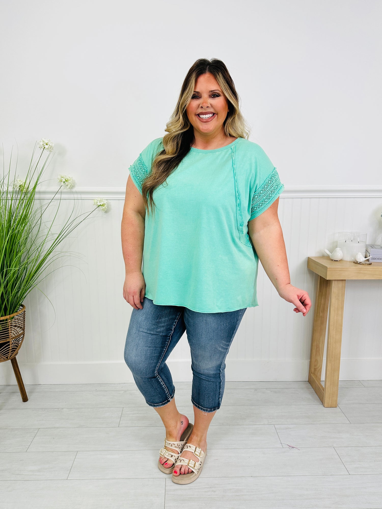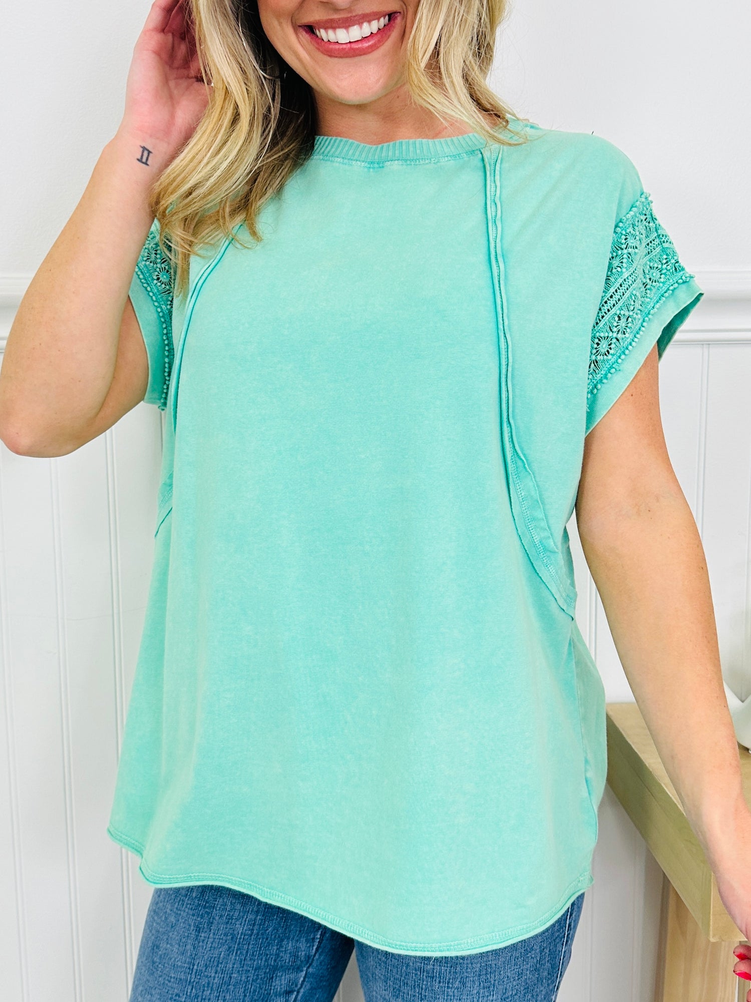 Designed with soft, lightweight fabric and eye-catching crochet sleeve details, this top brings the perfect mix of casual comfort and feminine flair. The reverse hem stitching brings a trendy, elevated look at an affordable price.