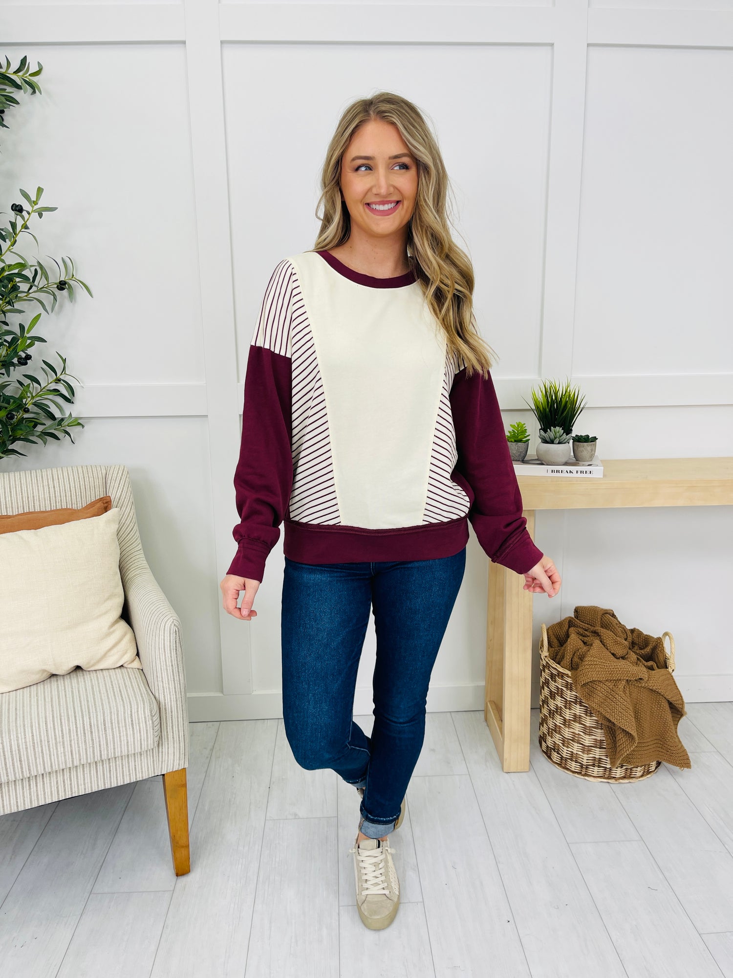 This top stands out with its striped side panels that bring a playful twist to the look. The bold color contrast between the deep burgundy sleeves and trim and the soft cream body makes it pop effortlessly. Finished with a relaxed fit design, this piece blends casual comfort with eye-catching detail that’s perfect for everyday wear.