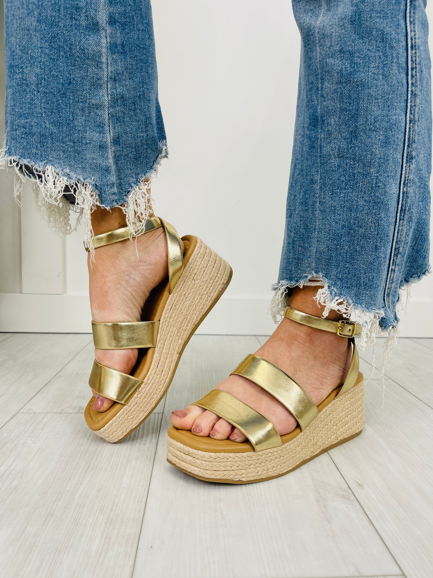 These stunning gold platform sandals feature a braided sole design that adds natural texture and a beautifully styled finish to your look. The smooth double straps create a clean, modern feel across the foot, while the adjustable ankle strap allows for a secure and comfortable fit. Easy to dress up or down, these sandals are the perfect warm-weather staple for pairing with denim, dresses, and everything in between.