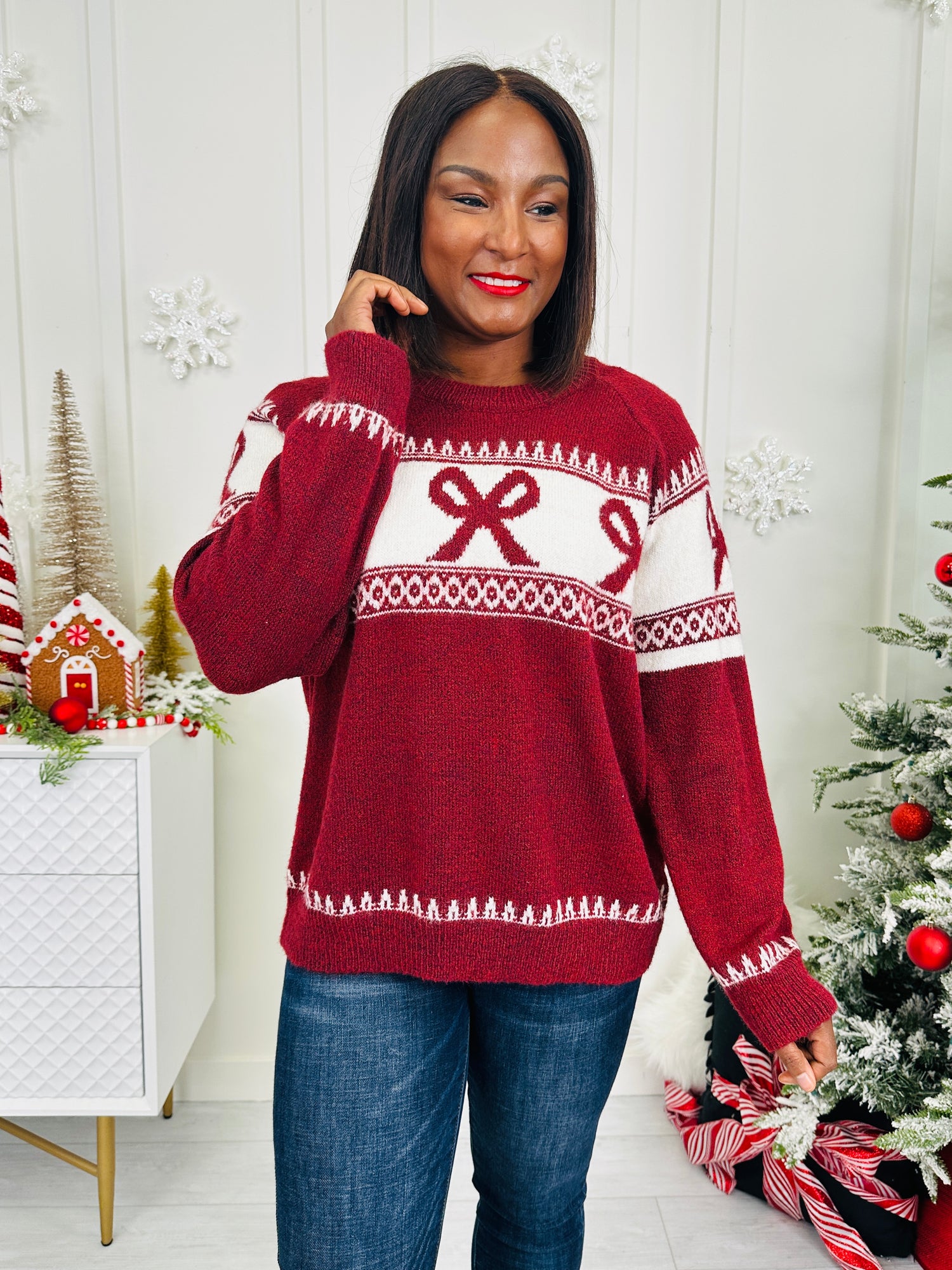 Make your season merry and bright with this charming holiday sweater. The festive bow pattern and contrasting color detail create a timeless, cheerful look that’s perfect for any celebration. With its cozy feel and classic design, this sweater pairs beautifully with denim or leggings for an effortlessly festive outfit you’ll love wearing year after year.