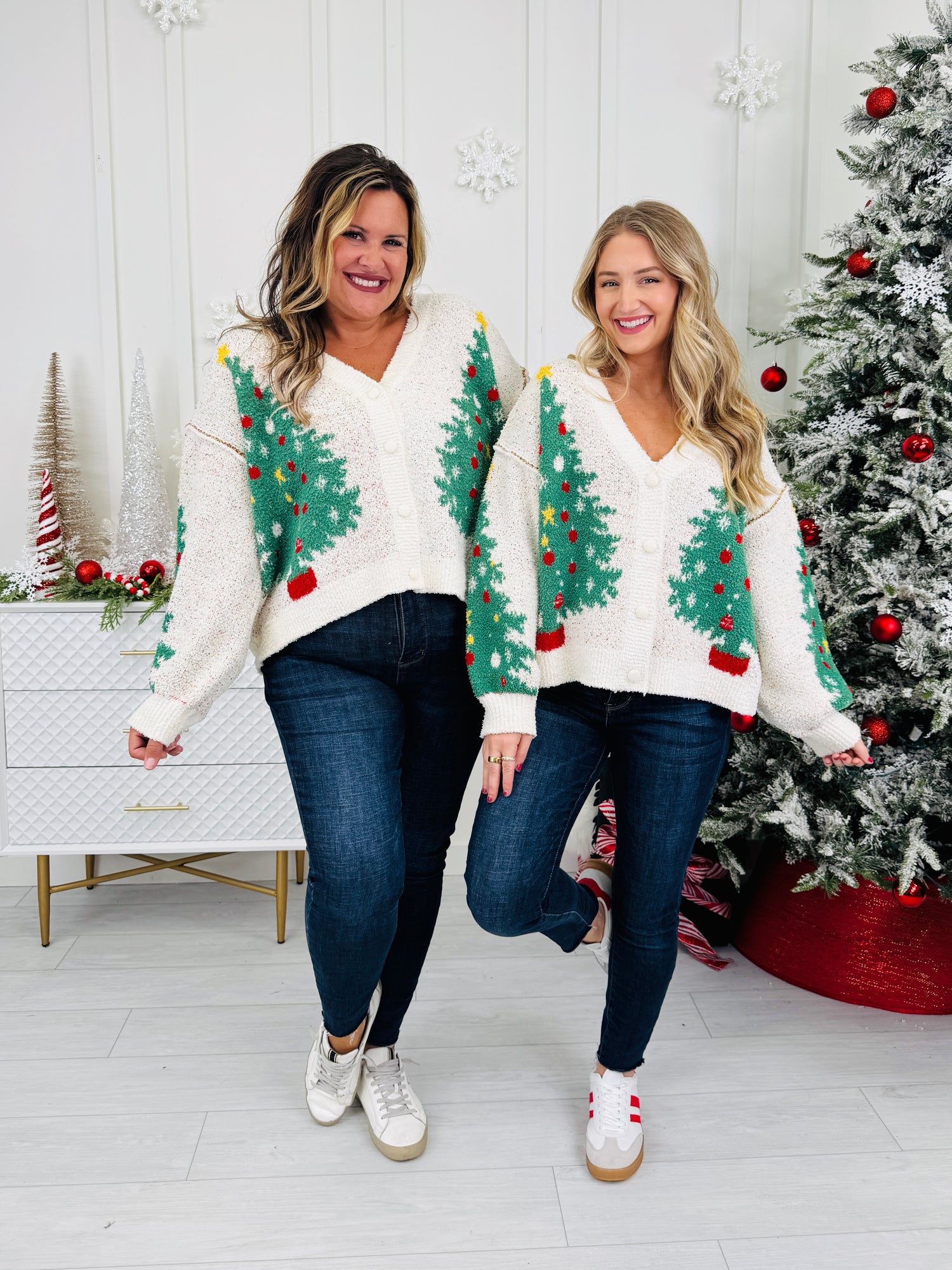 Bring holiday cheer to your wardrobe with this charming cardigan, featuring a playful Christmas tree design adorned with colorful details on the front and back of this piece. The button front closure makes it easy to wear open or closed, while the relaxed, cozy fit keeps you comfortable all season long. Perfect for everything from decorating the tree to casual holiday gatherings, this piece adds a touch of festive fun to any outfit.
