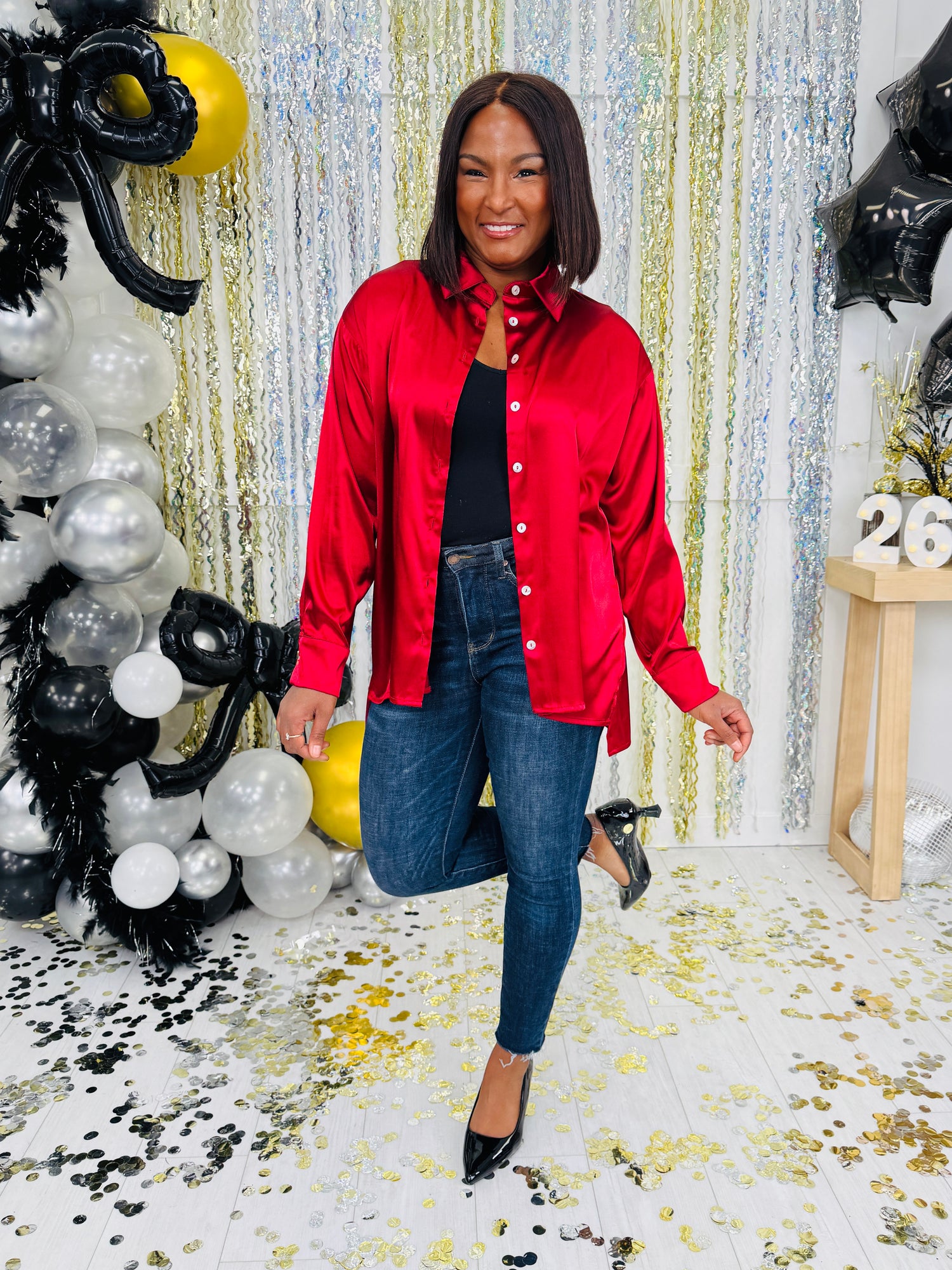 This stunning top features a satin-like sheen that adds a touch of elegance to any outfit. The button-down design and relaxed fit make it easy to wear, whether layered over a tank or styled on its own. Available in several colors, this versatile piece is perfect for elevating both casual and dressier looks with its timeless, sophisticated appeal.