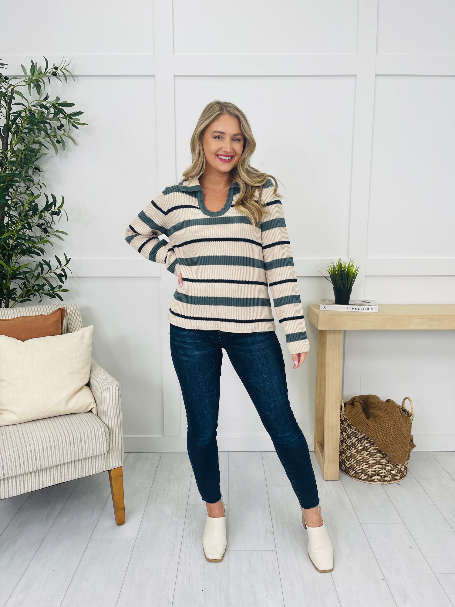 This stylish sweater features a bold striped design in trendy muted tones. The ultra comfy texture adds dimension and a cozy feel, while the scalloped collar detail brings a touch of femininity. It’s perfect for layering or wearing solo for a relaxed yet chic look.