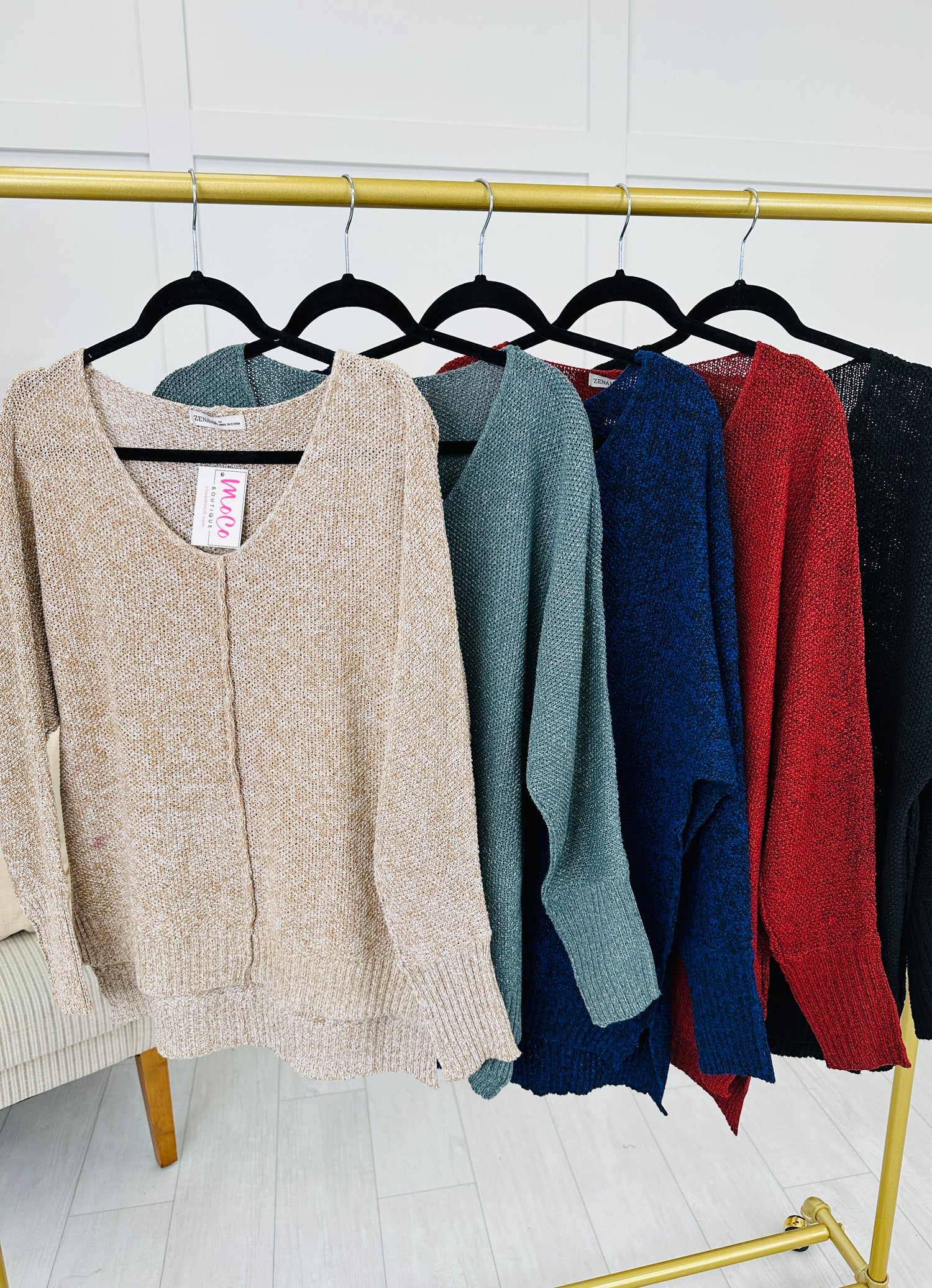 This textured knit sweater has an easy drape with a clean V-neckline and a defined center seam that adds a polished touch. A high-low hem with side slits plus banded cuffs and hem finish the look with simple structure. Available in several colors, it pairs effortlessly with denim for everyday wear.