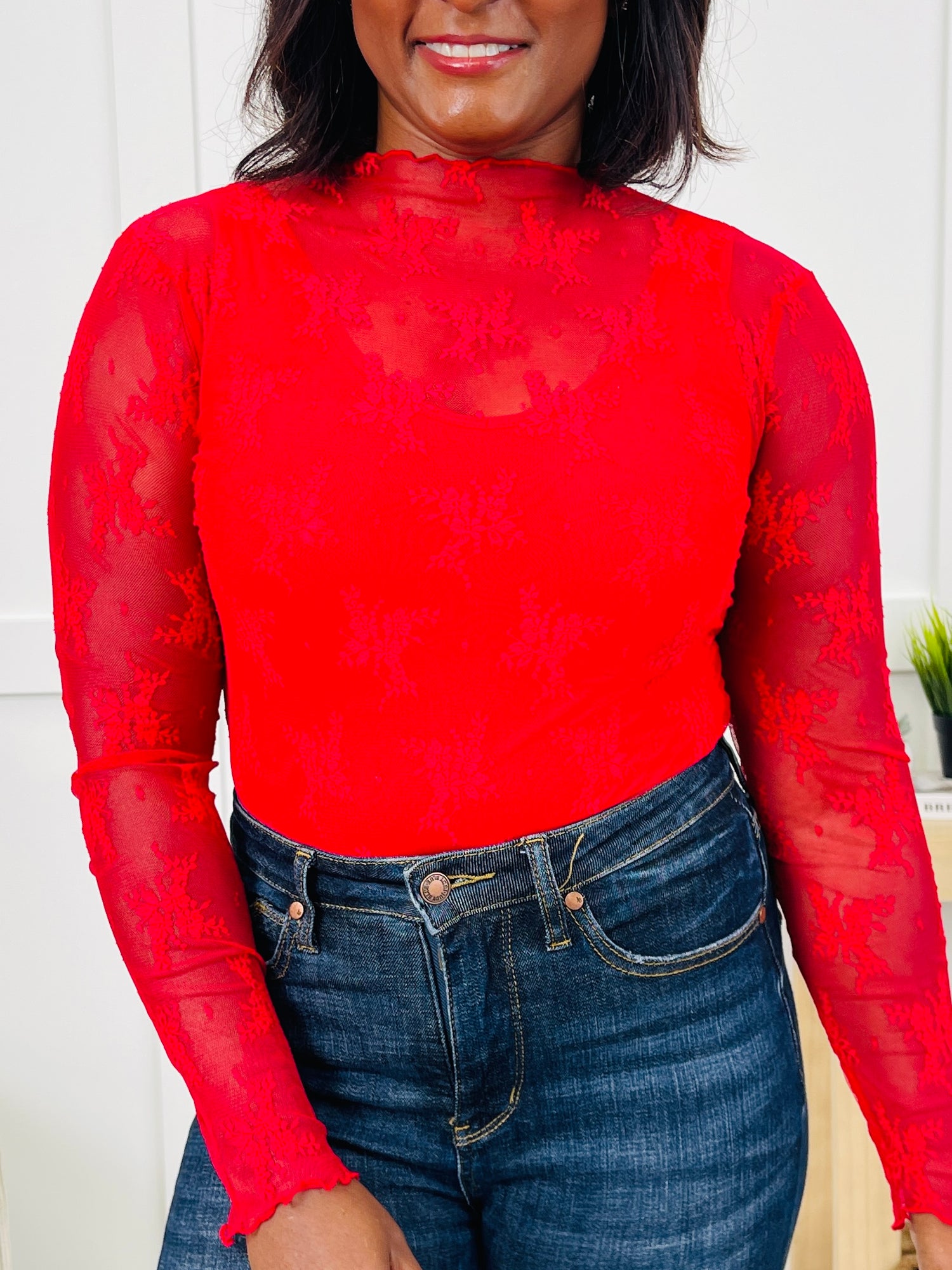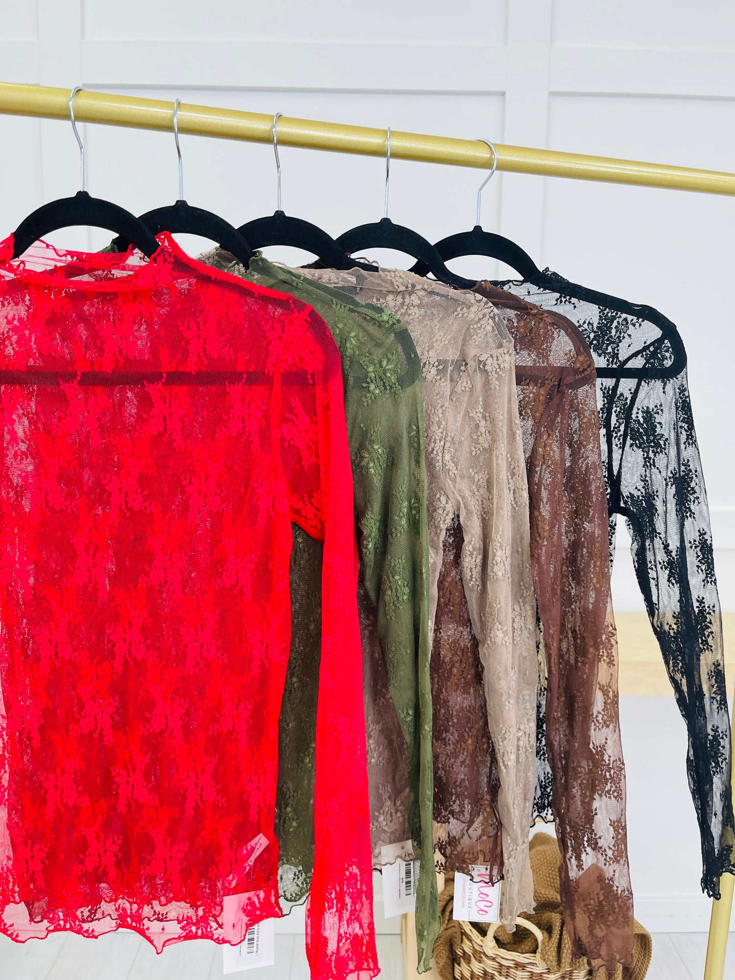 Turn up the charm with this stunning lace top, available in several gorgeous colors. The sheer lace fabric and floral embroidered pattern create a beautifully delicate look that feels both bold and feminine. The mock neckline adds a touch of elegance, making this piece perfect for layering or styling on its own for an effortlessly elevated outfit.