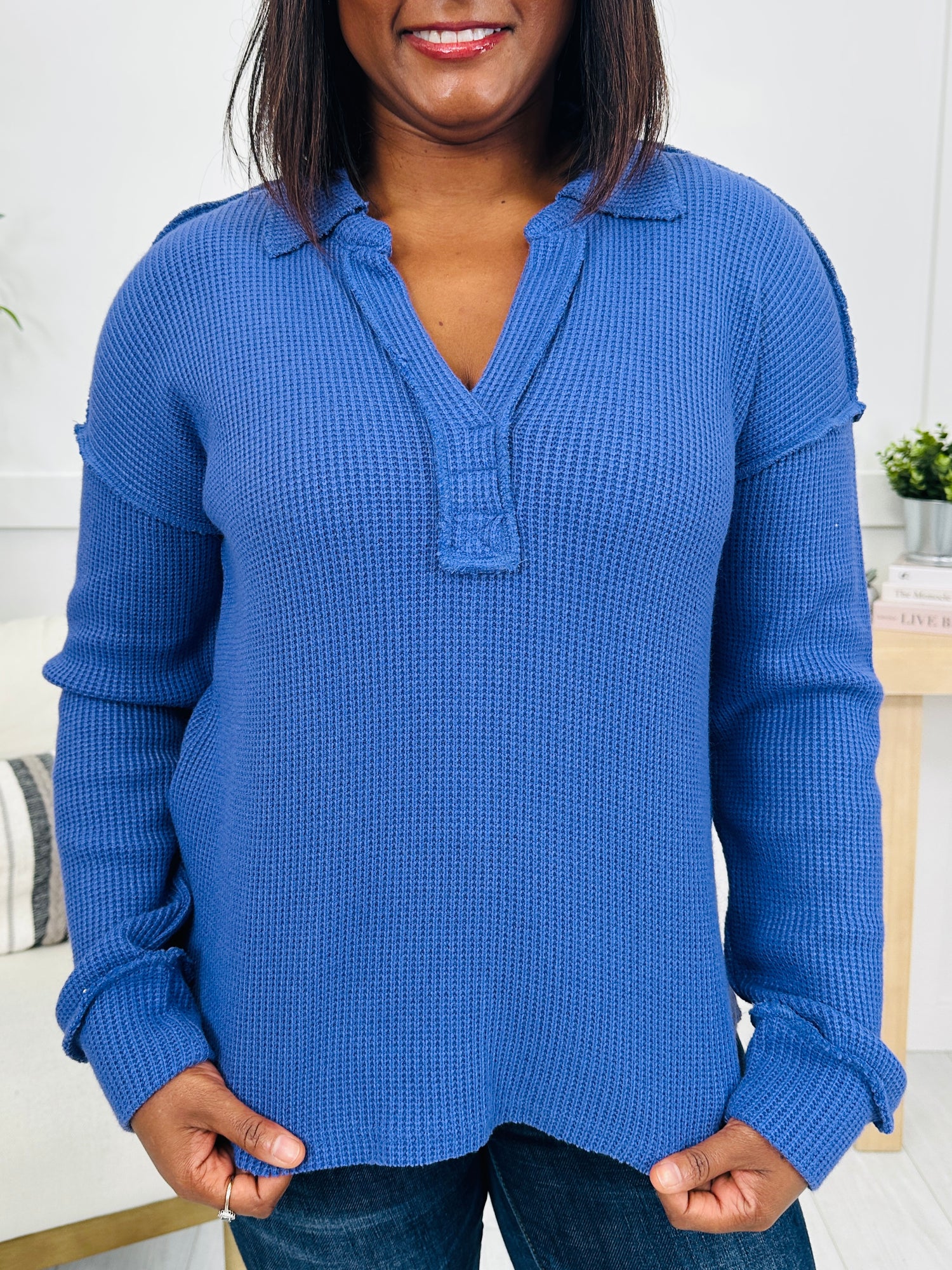 This top features a split collar neckline that gives it a casual but elevated feel, paired with a textured waffle knit that stands out beautifully. The relaxed fit creates an easy-going silhouette that pairs effortlessly with denim or leggings, making it a grab-and-go favorite for everyday wear. Visible seam detailing adds a touch of laid-back character, giving this piece a comfy and stylish vibe all at once.