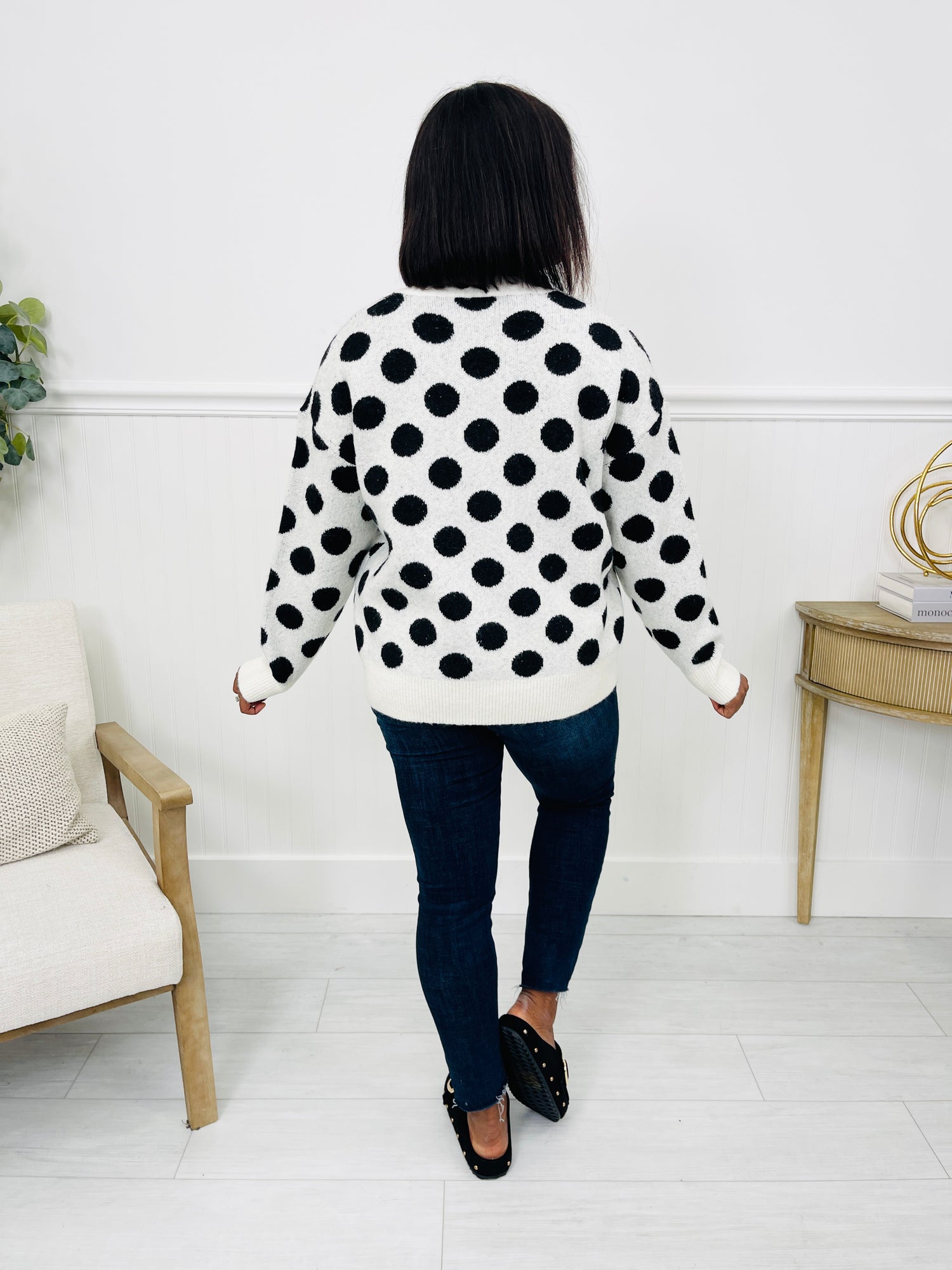 A cheerful classic, this sweater pops with bold black polka dots on a light oatmeal base. The clean V-neckline and relaxed silhouette make it easy to dress up or down, while the banded cuffs and hem give it a polished finish. Pair it with denim for everyday or layer over a crisp tee when you want playful, cozy vibes.
