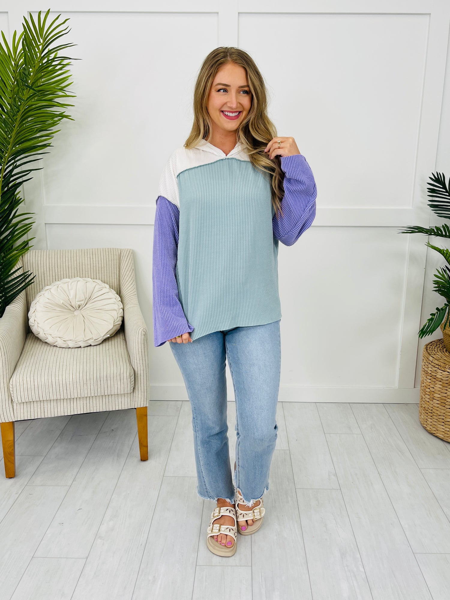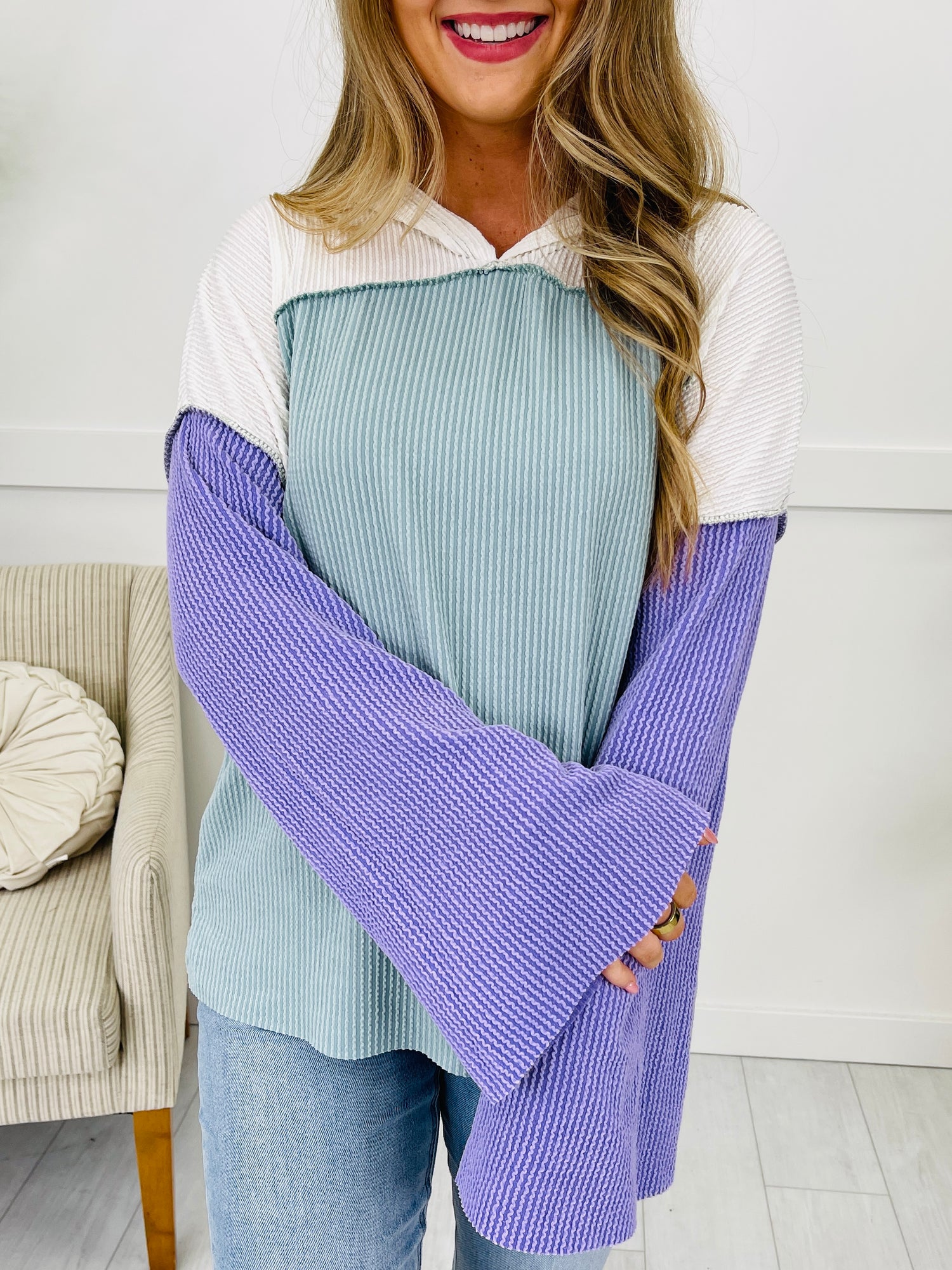 Fun colors and standout sleeves? Say no more! This playful pullover features a soft, textured knit with bold colorblocking that keeps things fresh and flattering. The wide, flared sleeves add a breezy, relaxed feel that’s perfect for pairing with denim and letting your personality shine.