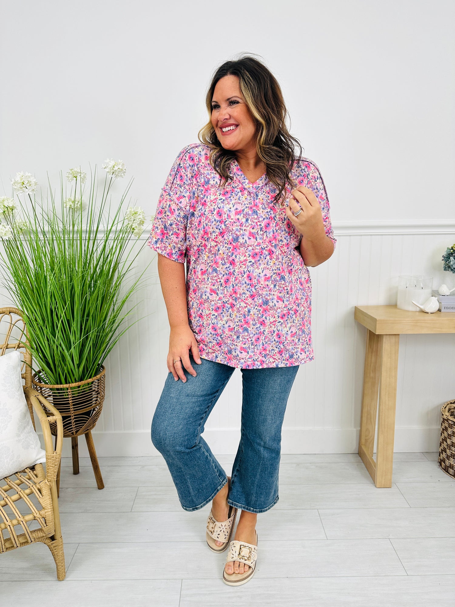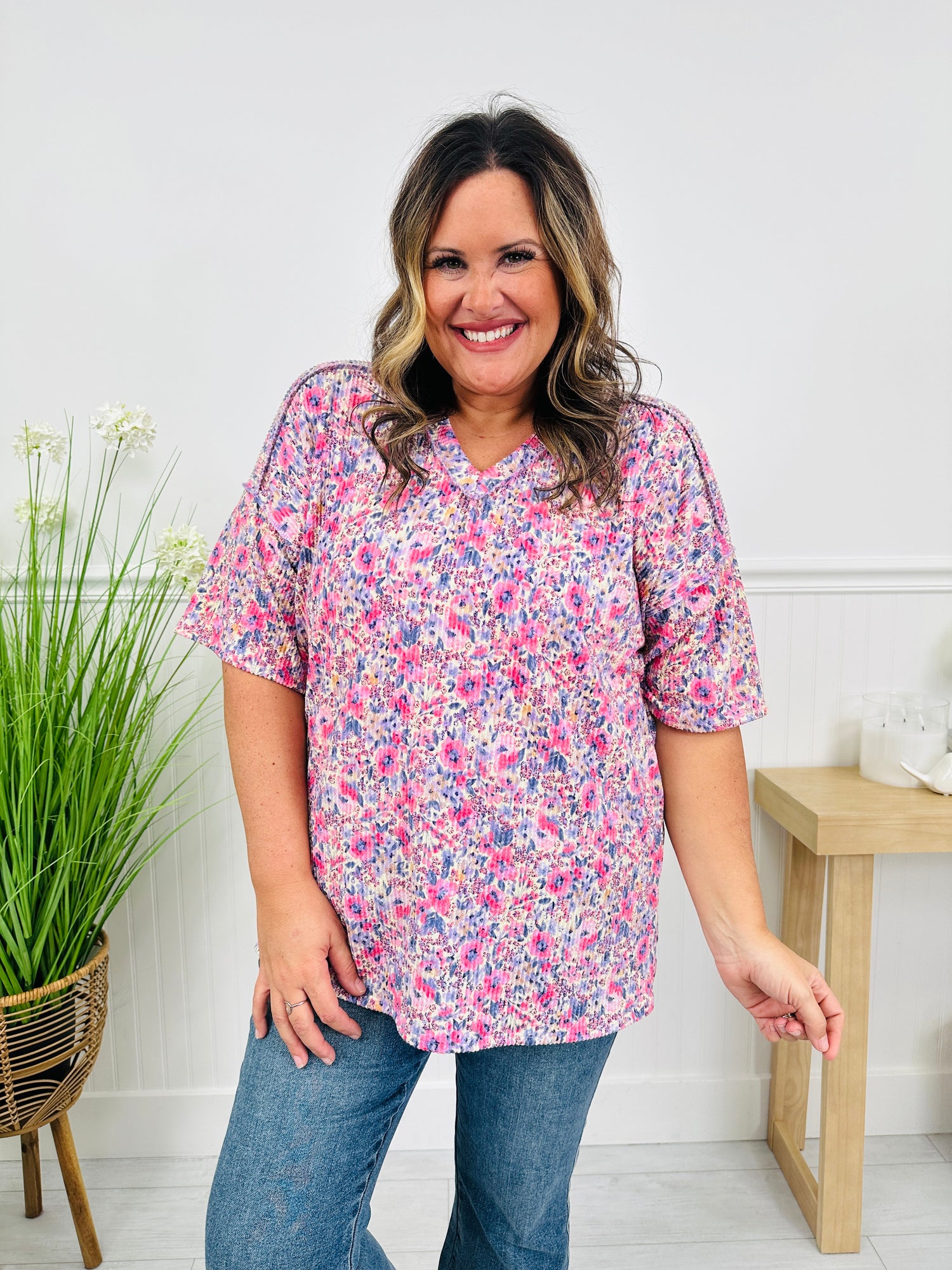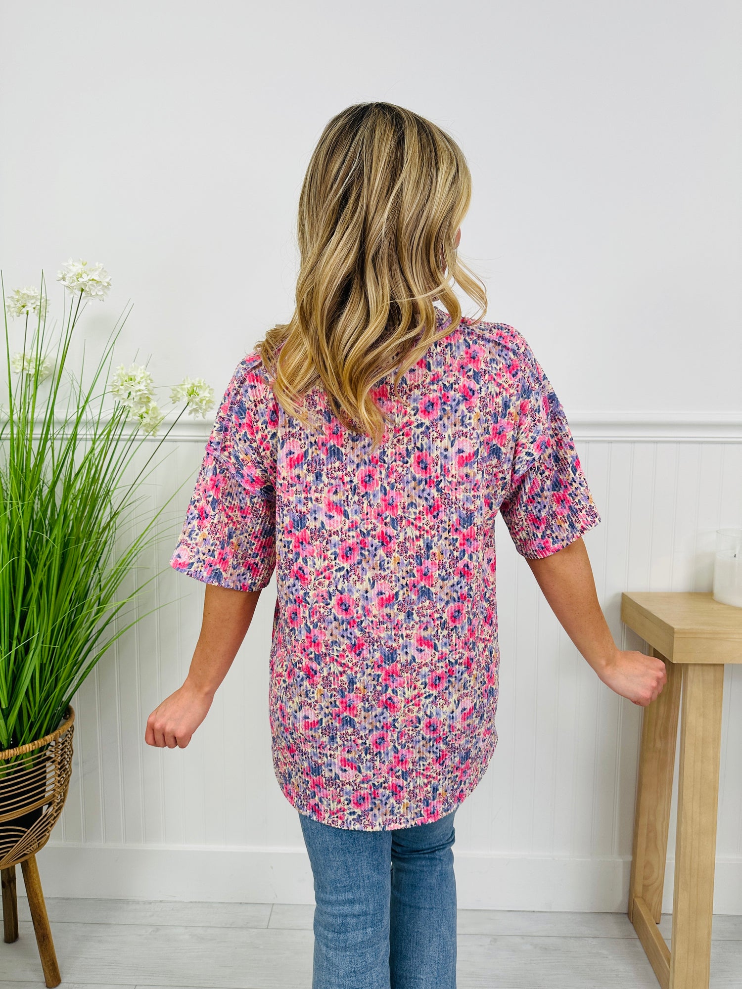 You'll be dreaming of sunshine as soon as you put this new top on. This top is made from our best selling raised rib material that our customers rave about. It usually is only made in solids but for the first time, we decided to create it in bright and bold prints that will instantly boost your mood and have you dreaming of the sunny days ahead.