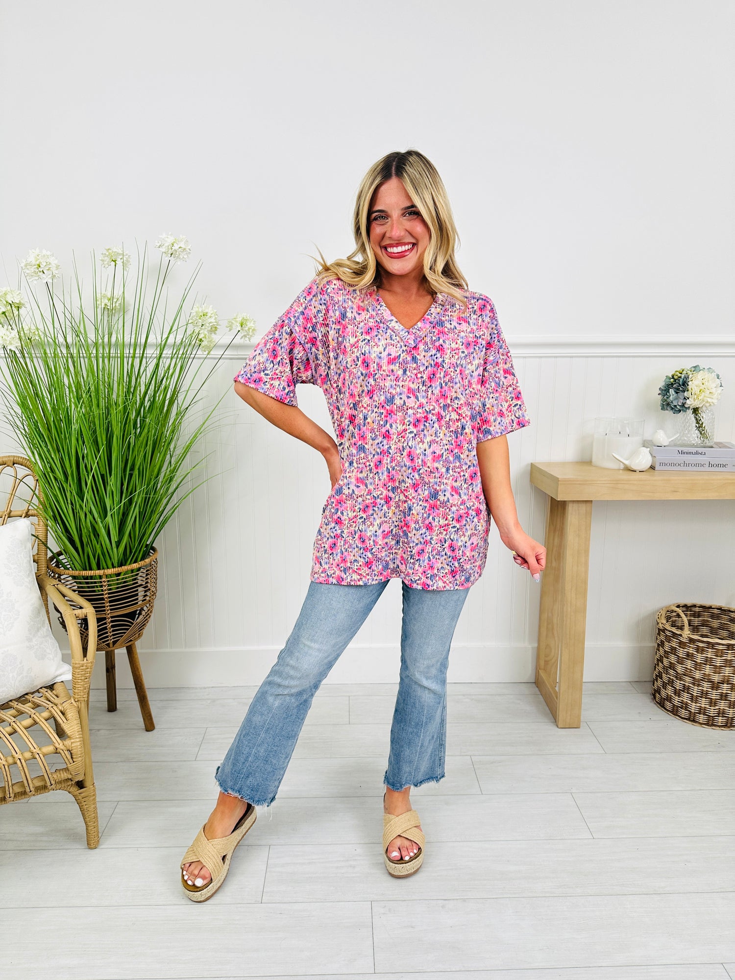 The relaxed fit drapes comfortably without clinging and is flattering on every body type. Designed with a flattering and feminine v-neckline and short sleeves, it’s the kind of throw-on-and-go top that still looks styled. Pair it with your favorite jeans or shorts for multiple, versatile looks. Comfortable, versatile, and eye-catching in the best way—this one earns its spot on repeat.