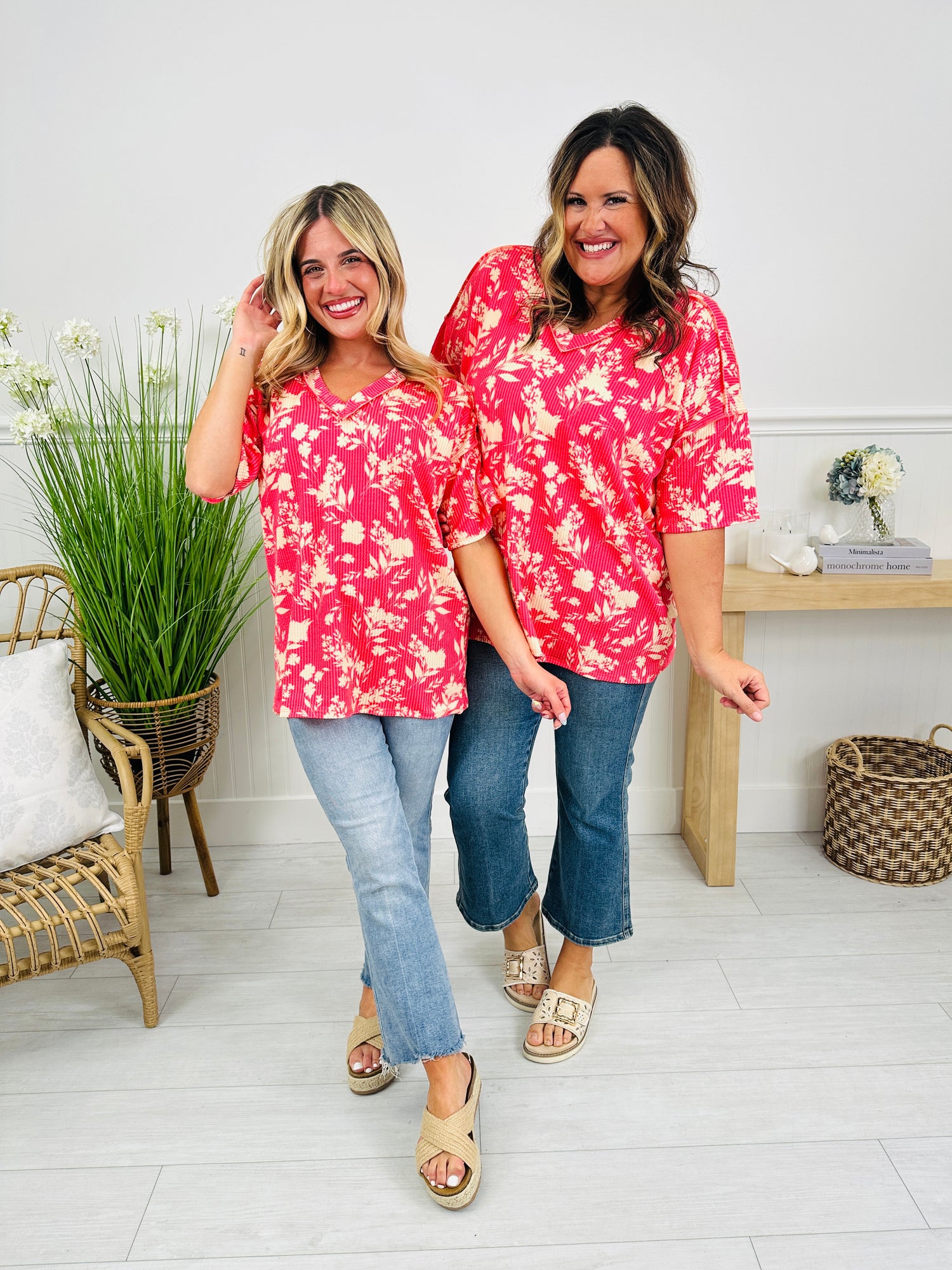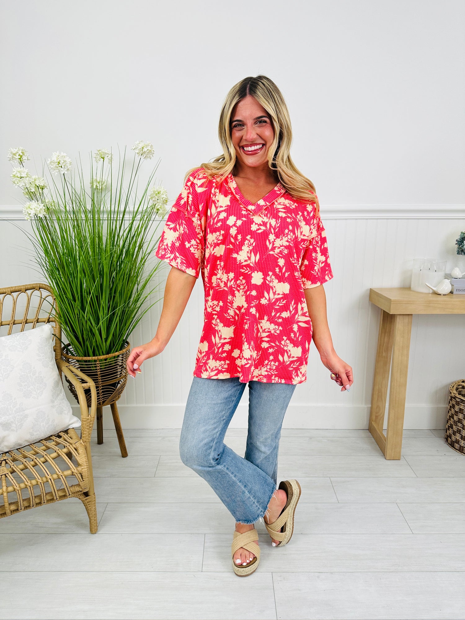 You'll be dreaming of sunshine as soon as you put this new top on. This top is made from our best selling raised rib material that our customers rave about. It usually is only made in solids but for the first time, we decided to create it in bright and bold prints that will instantly boost your mood and have you dreaming of the sunny days ahead.