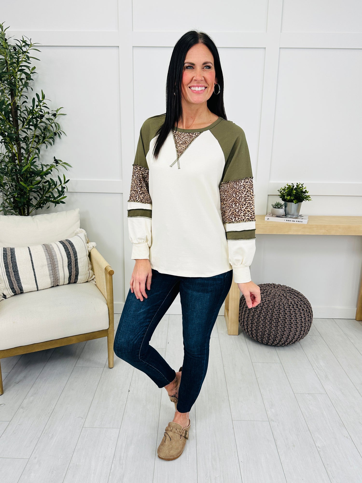 This top combines a playful leopard print with contrasting raglan sleeves for a chic and sporty look. The cozy fabric and relaxed fit offer all-day comfort, while the unique stitching detail across the chest adds an extra touch of style. Perfect for pairing with jeans or leggings, this piece brings the best of bold prints and casual comfort.