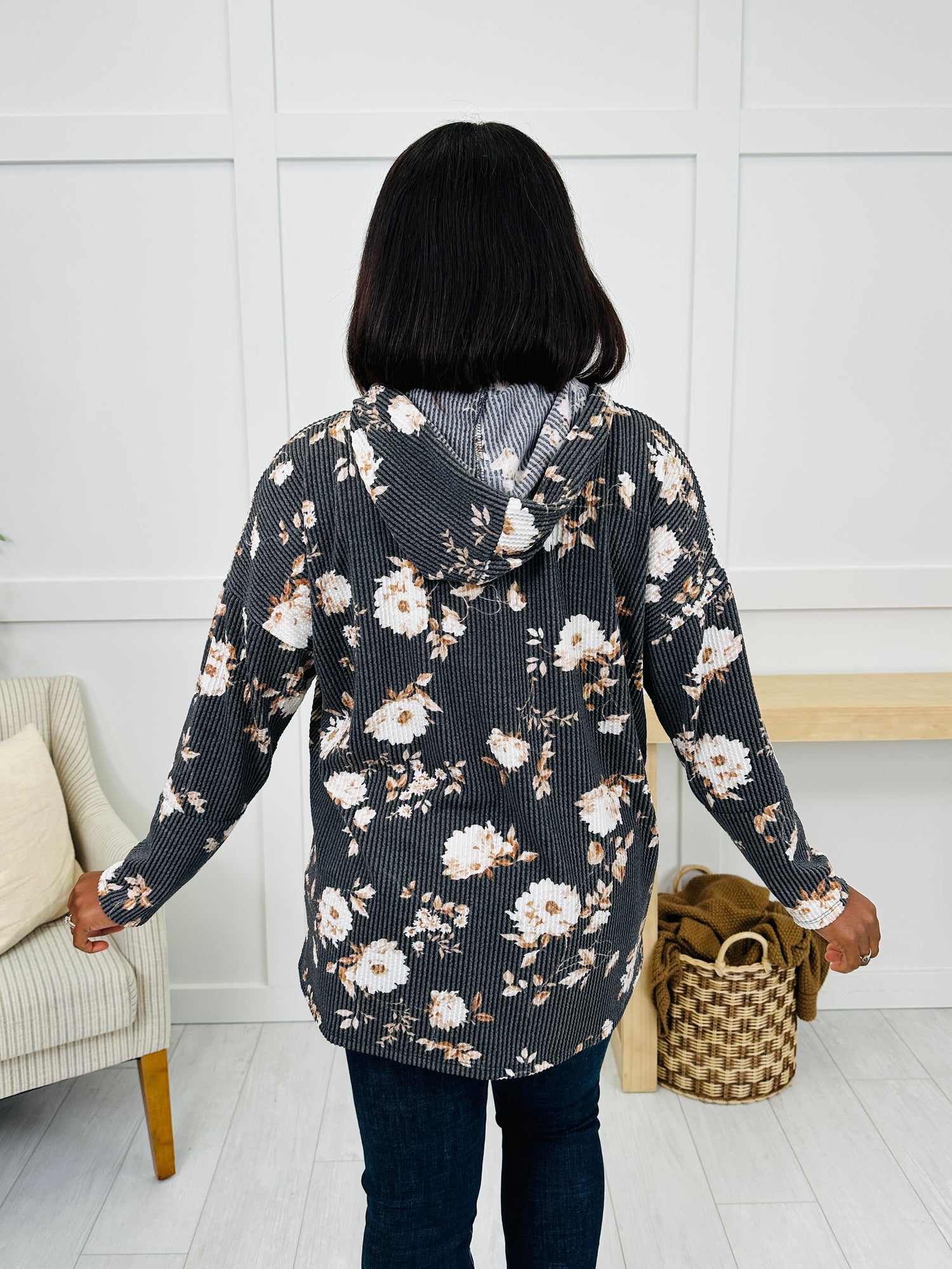 This cozy hoodie combines a beautiful floral print with a soft, raised rib texture for a relaxed and stylish look. The button-up neckline adds a cute, functional touch, while the kangaroo pocket gives you a practical place to store small items or warm your hands. Perfect for layering, this top offers both comfort and style in one easy-to-wear piece.