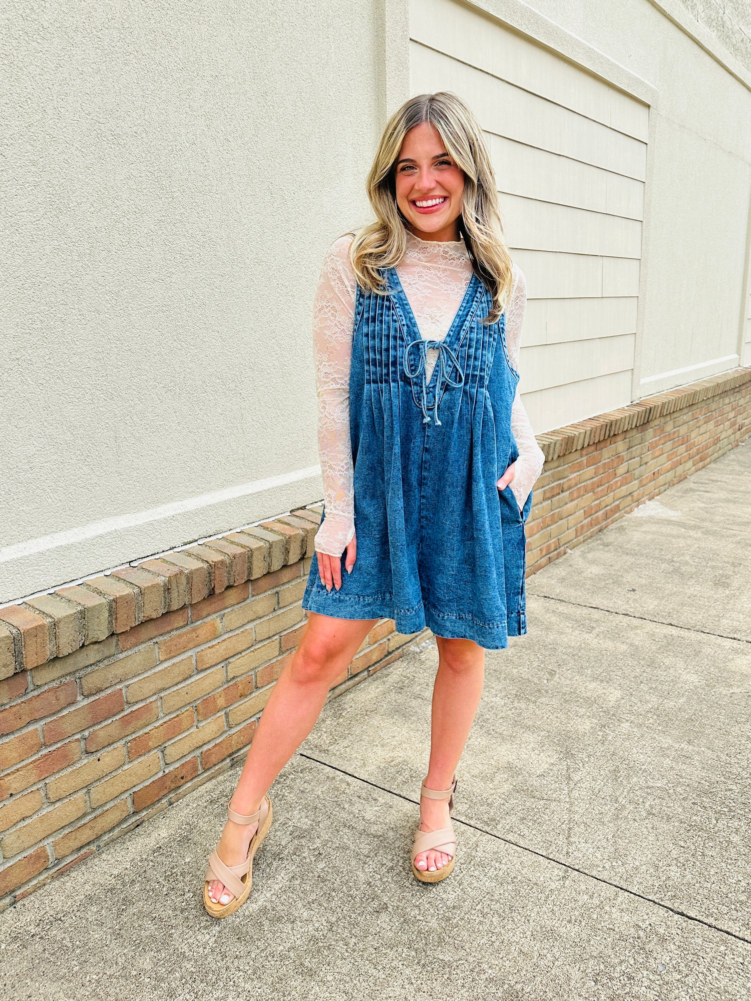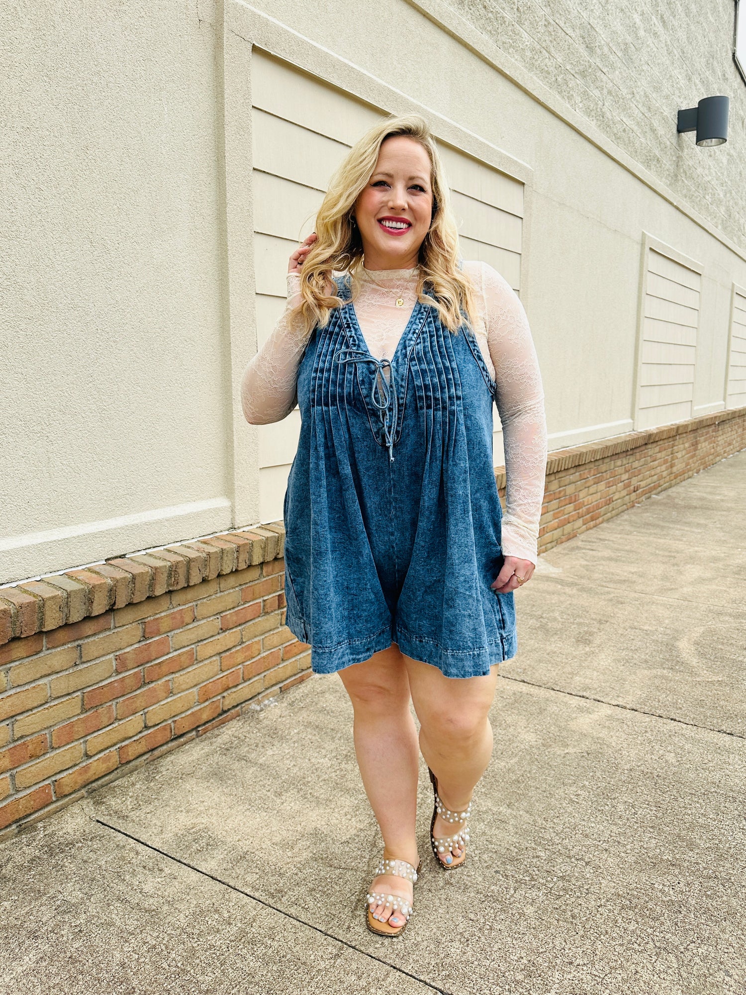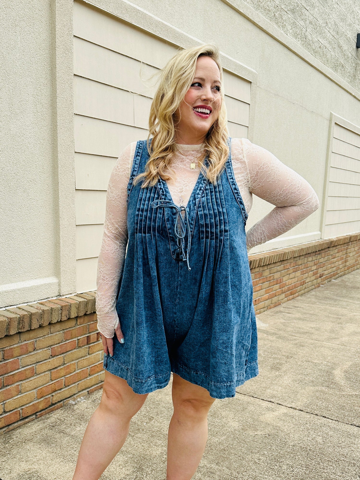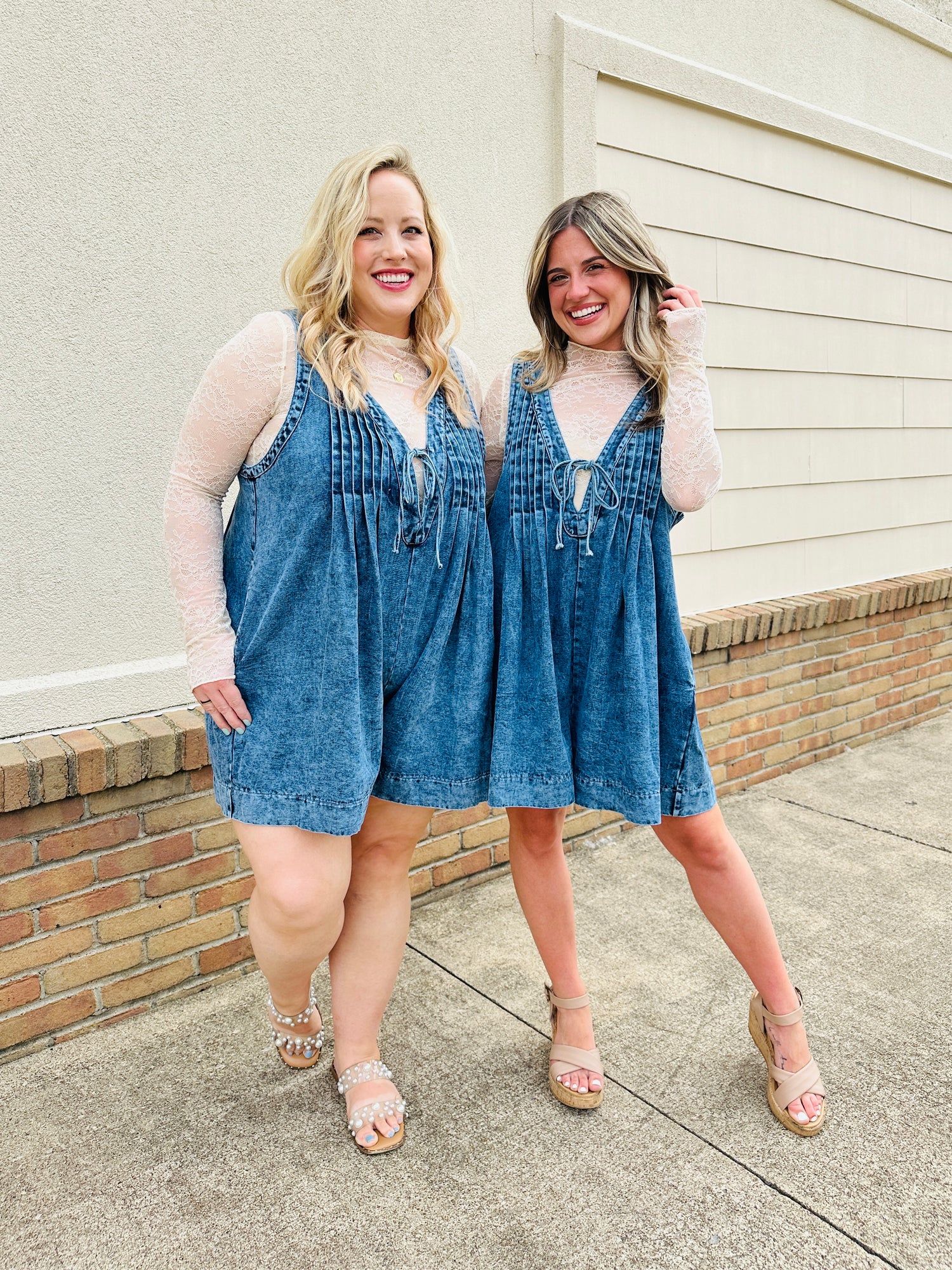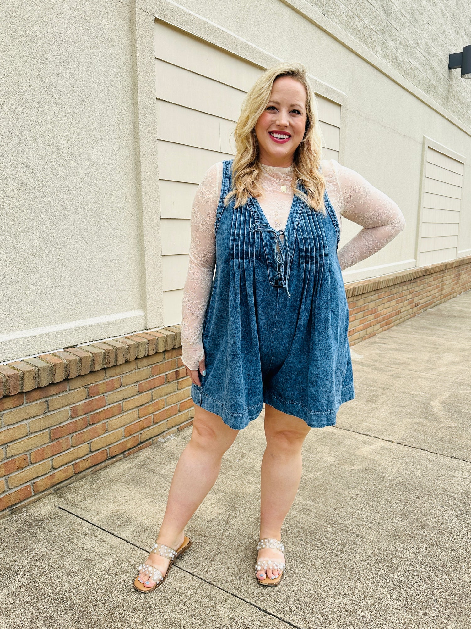 Denim meets darling in this ultra-cute wide leg romper that brings charm and comfort together effortlessly. Featuring structured pleats along the front and back, an adjustable front tie neckline, and a soft, flowy fit through the body, it’s made for playful layering and warm-weather ease. Style it with lace sleeves or a basic tee for an effortlessly put-together look that feels as fun as it is flattering.