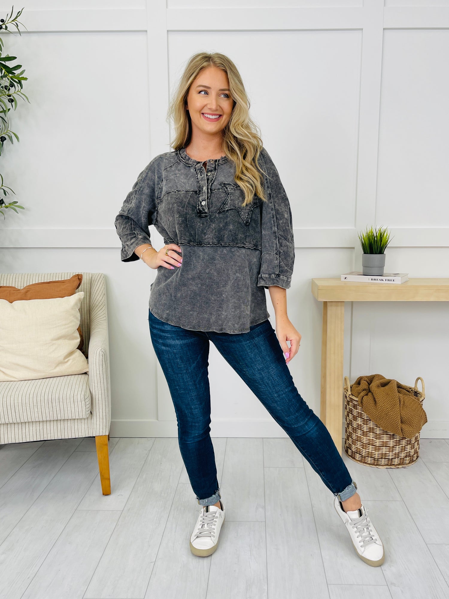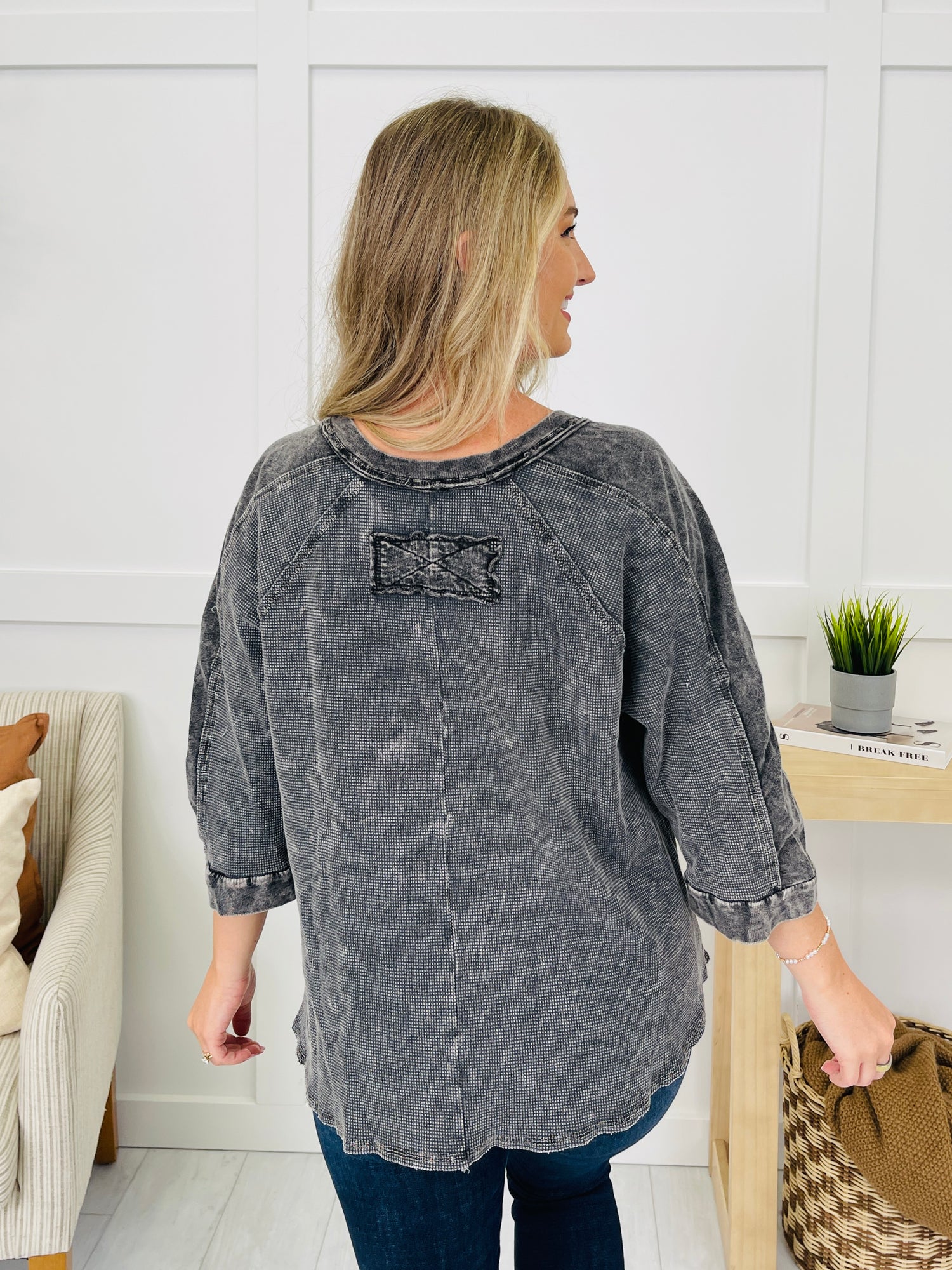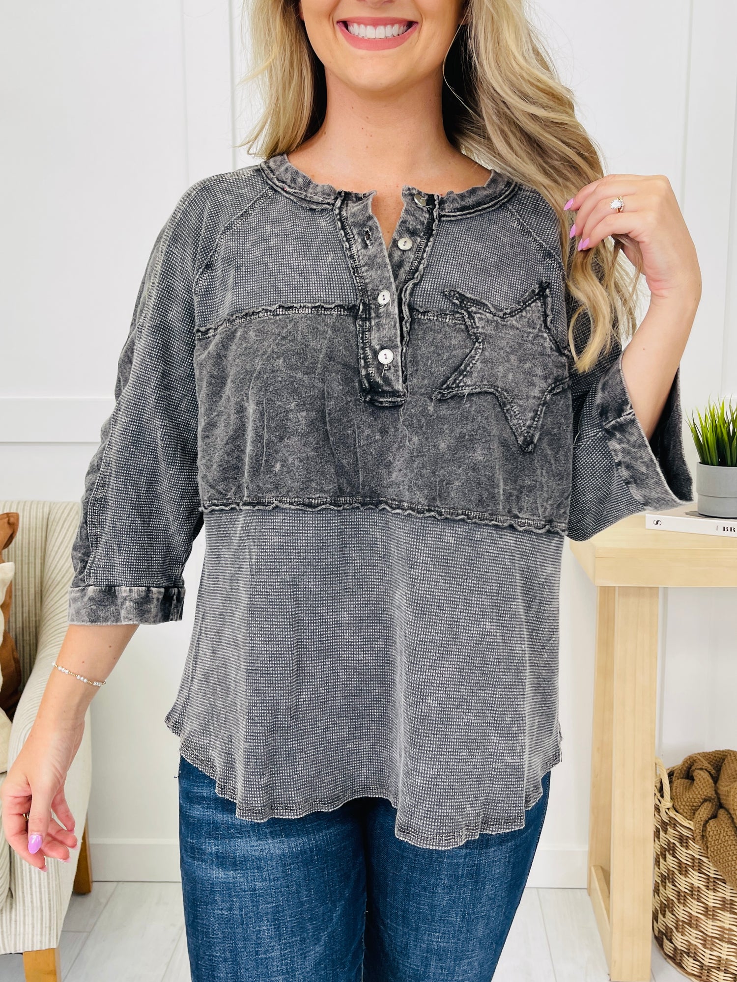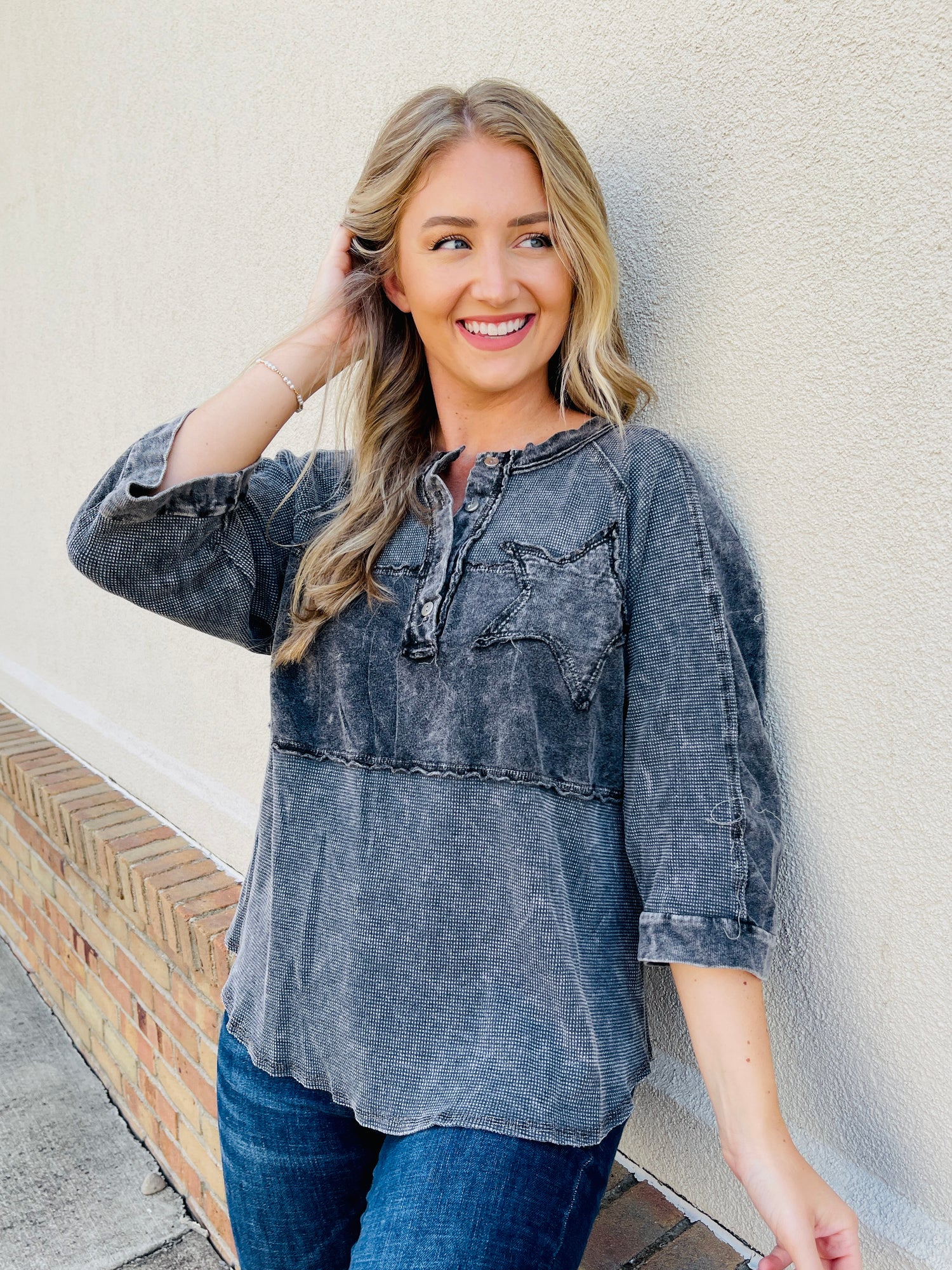 This laid-back pullover brings playful edge with its oversized frayed star appliqué and contrasting panels. The mix of cozy knit and smooth mineral washed fabric adds dimension, while the easy Henley placket and 3/4 sleeves add just the right touch of structure. With its relaxed fit and softly curved hem, it’s the perfect pick for weekend adventures or casual coffee dates.