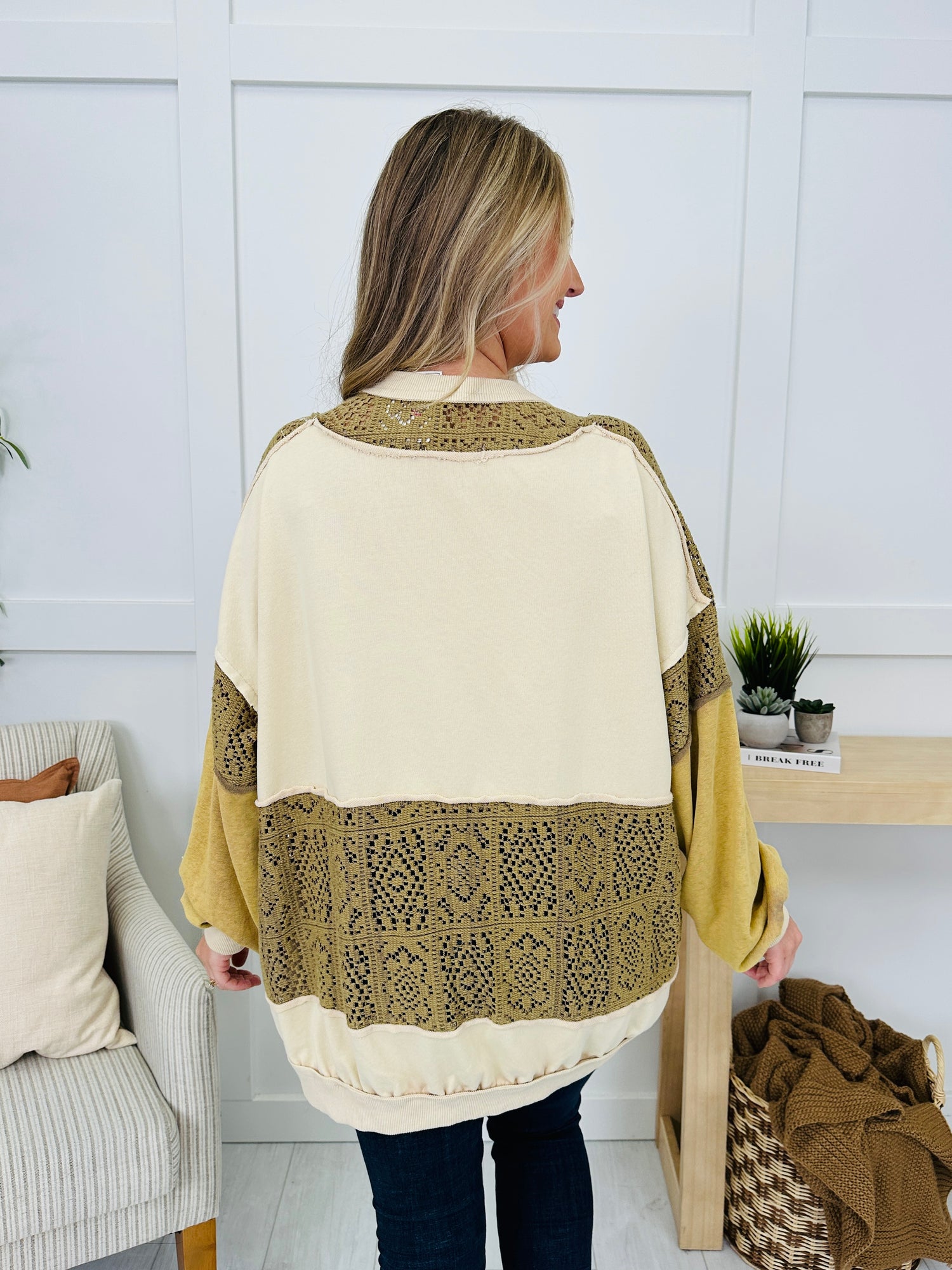 This relaxed pullover features a crew neckline framed by a patterned panel that continues onto the tops of the long sleeves for added texture. Color-blocked sleeves and curved contrast patch pockets bring a playful mix, while exposed seam accents and a banded hem keep it casual and easy. An effortless match with denim that you'll love!